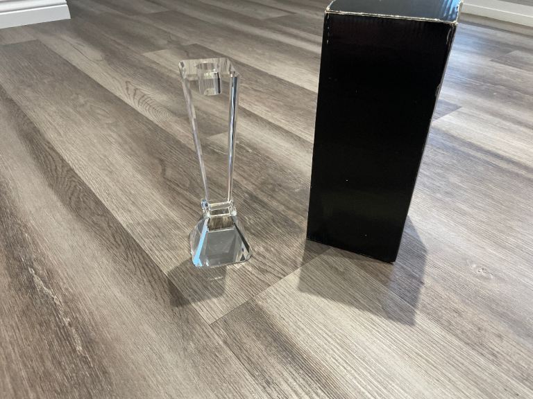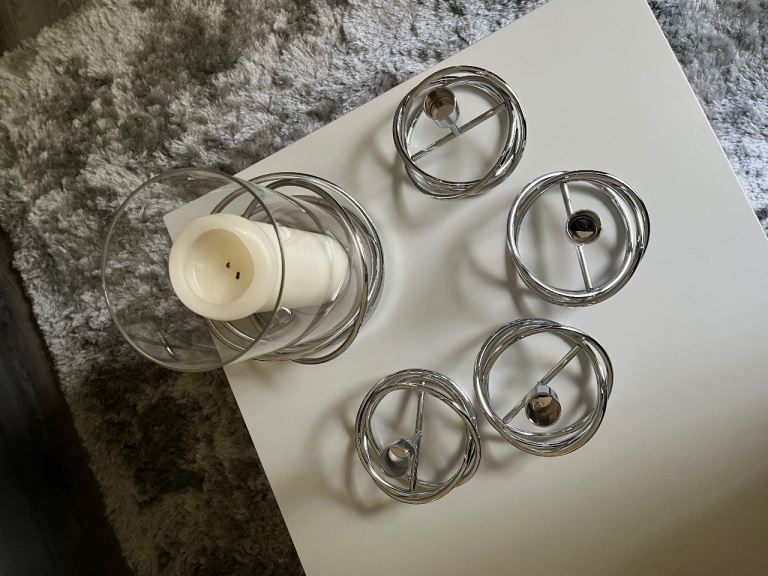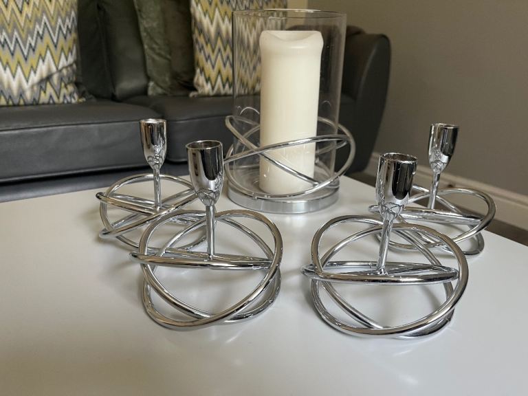4 stunning silver twist design candle holders with matching hurricane lamp
