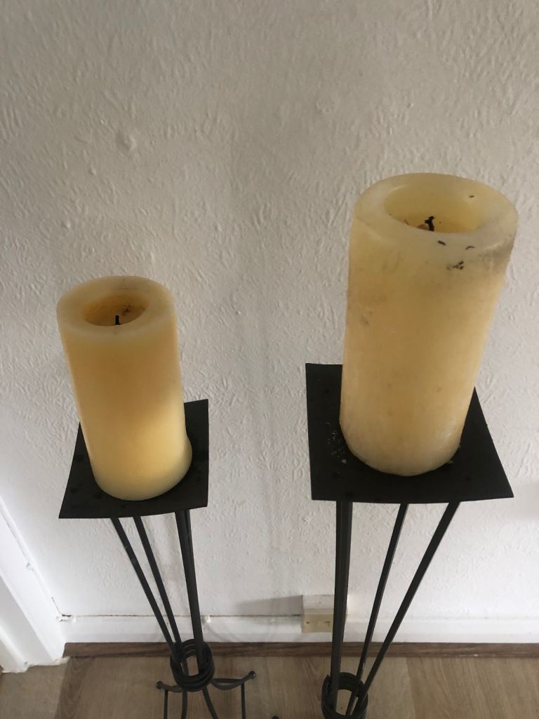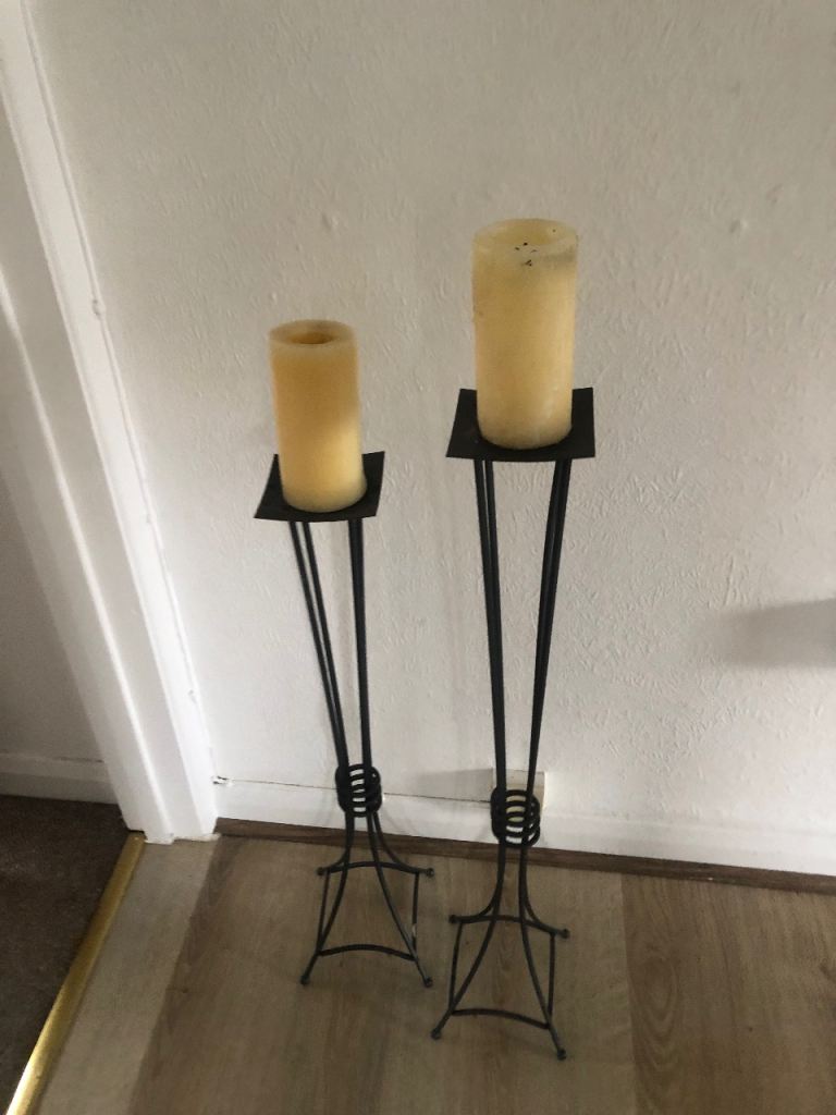 Black cast iron candle holders, 34” and 27” tall. Only £10 for the pair