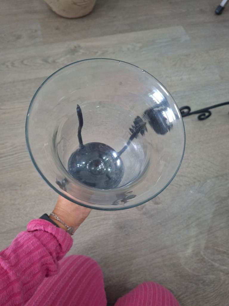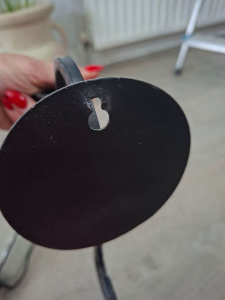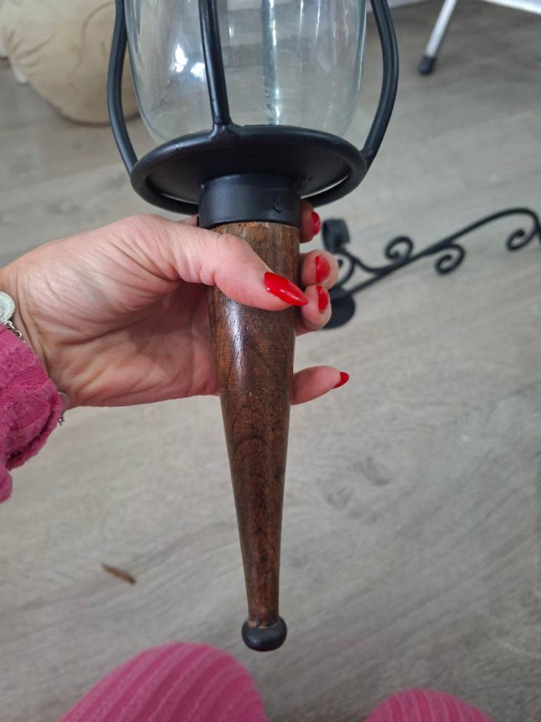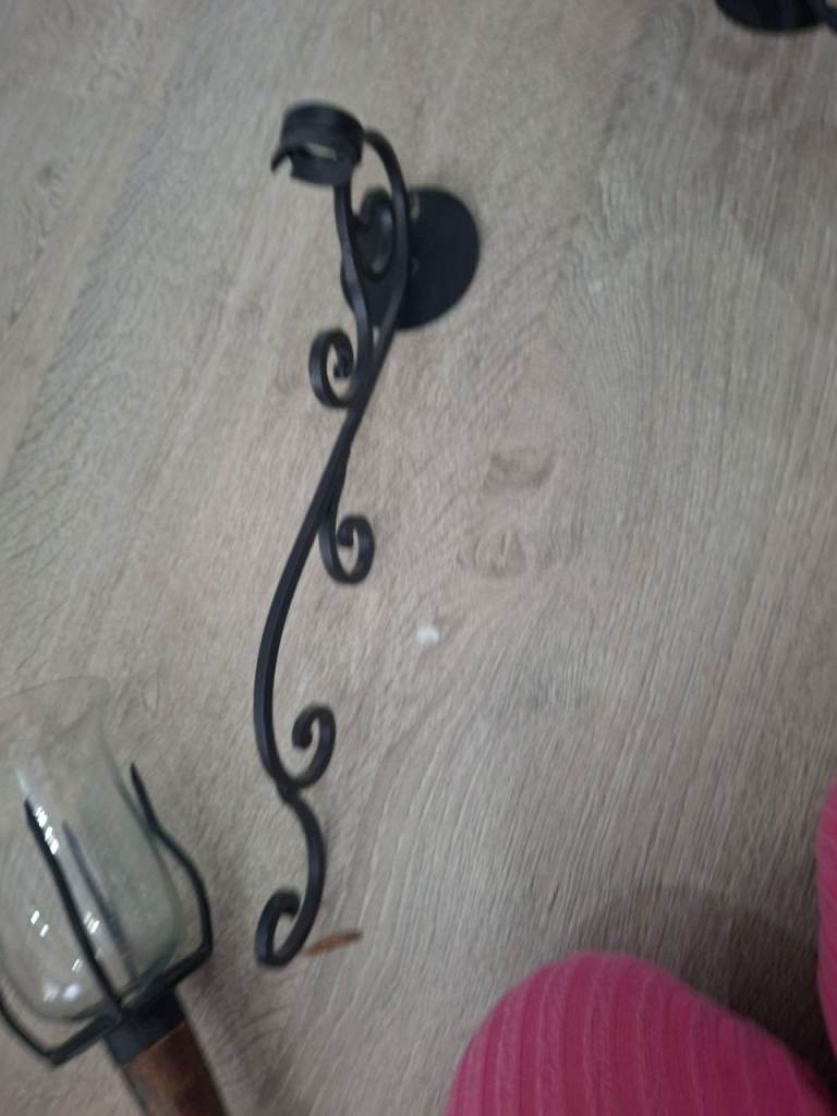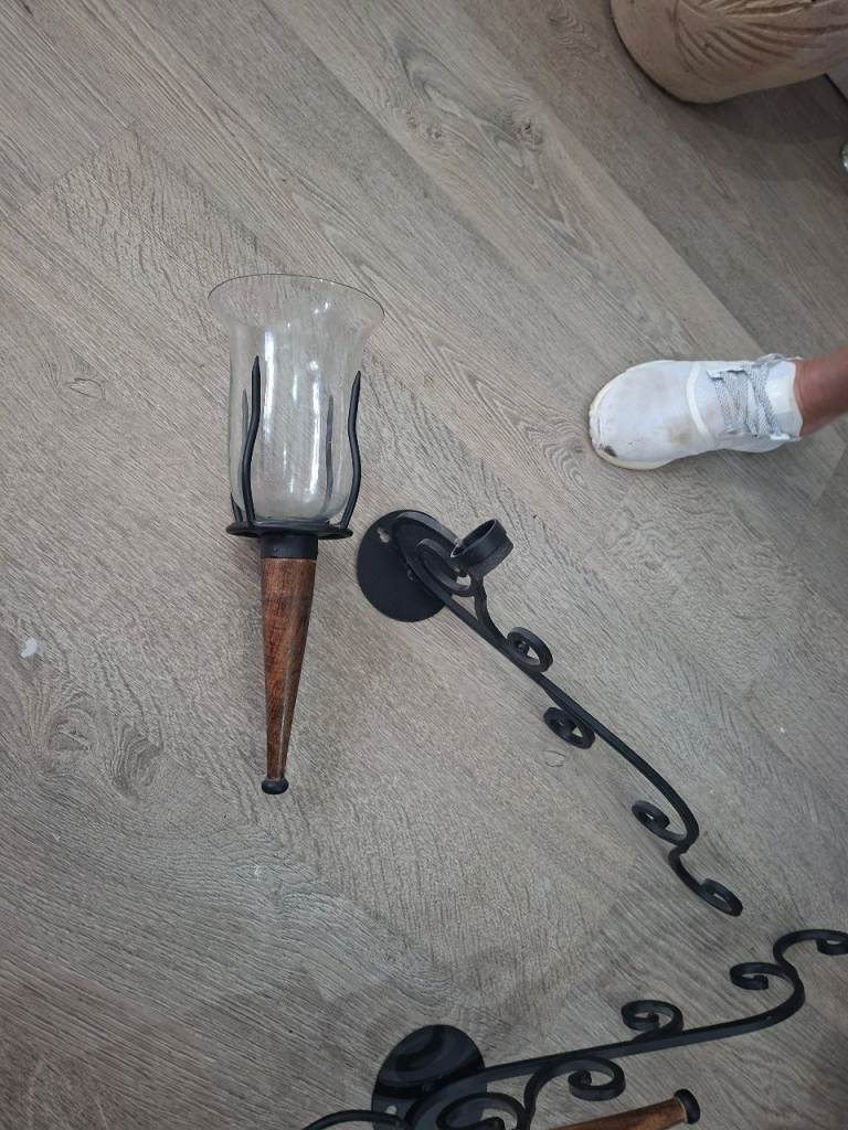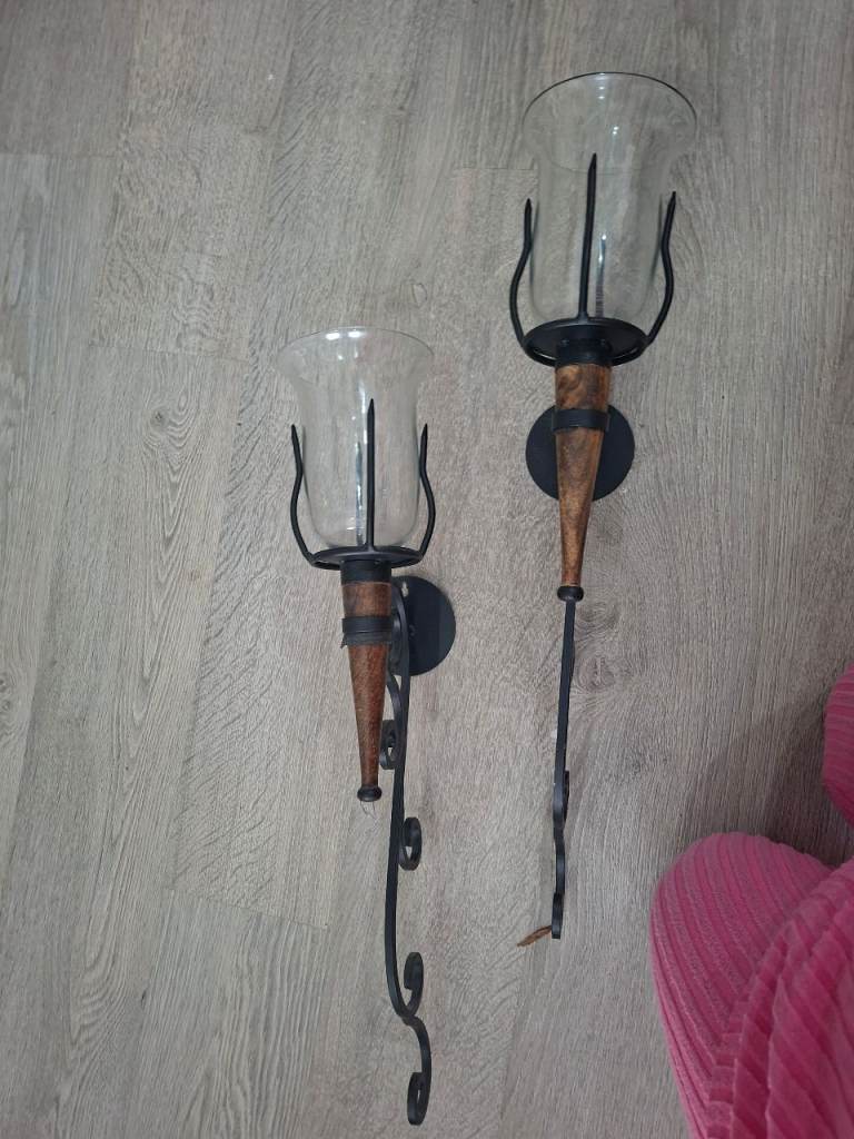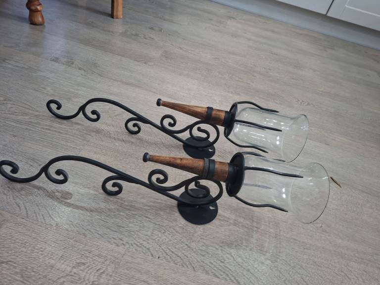 Black iron wall mounted candle holders with wood finish one of the glass holders has small chip can been seen in photo its on the top so won't be seen once on the wall they will look fabulous any where in your home to give finished look