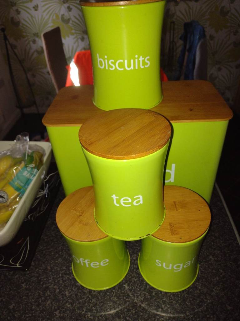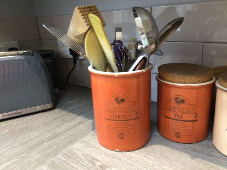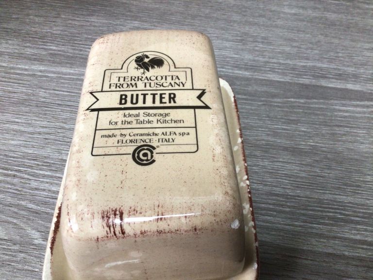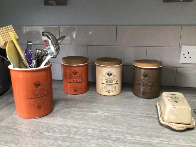 Tuscany Terracotta, coffee, tea, sugar, butter dish and utensils container. Very attractive addition to your kitchen, some wear and tear on the utensil pot and butter dish