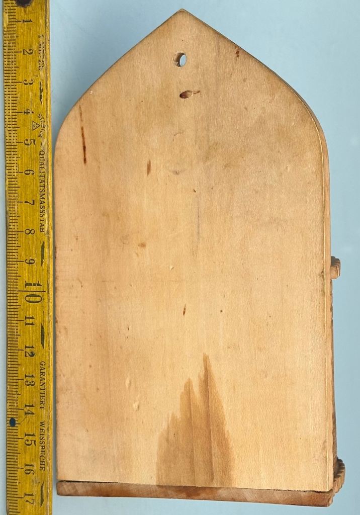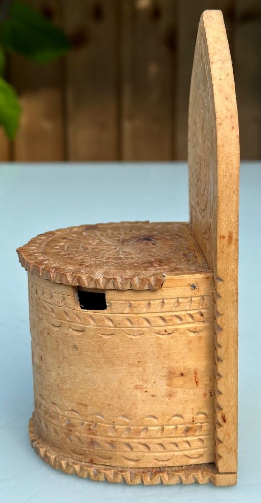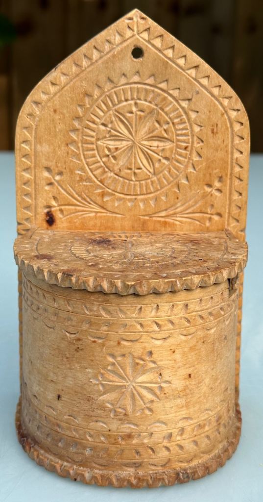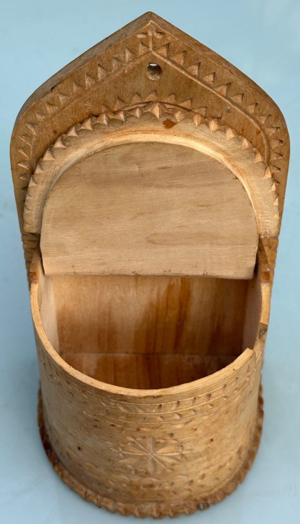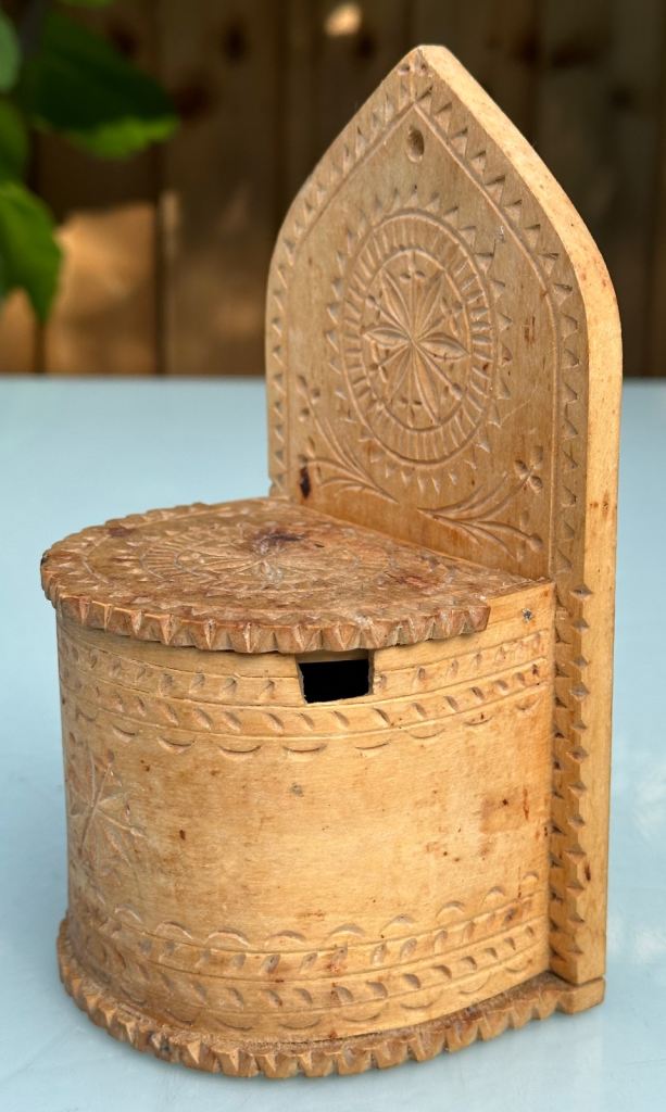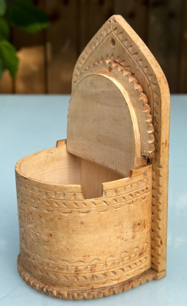 It’s a wall mountable hand carved wooden Salt storage box, Salt Pig, Cellar dating to the early mid century and probably originating from Norway.