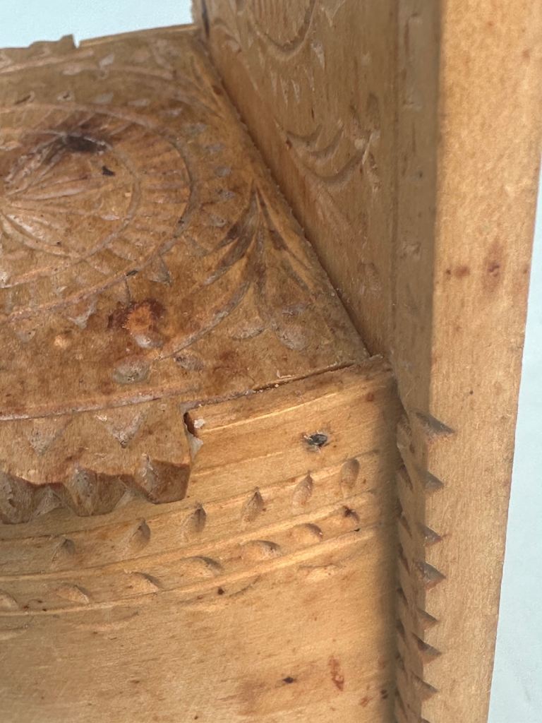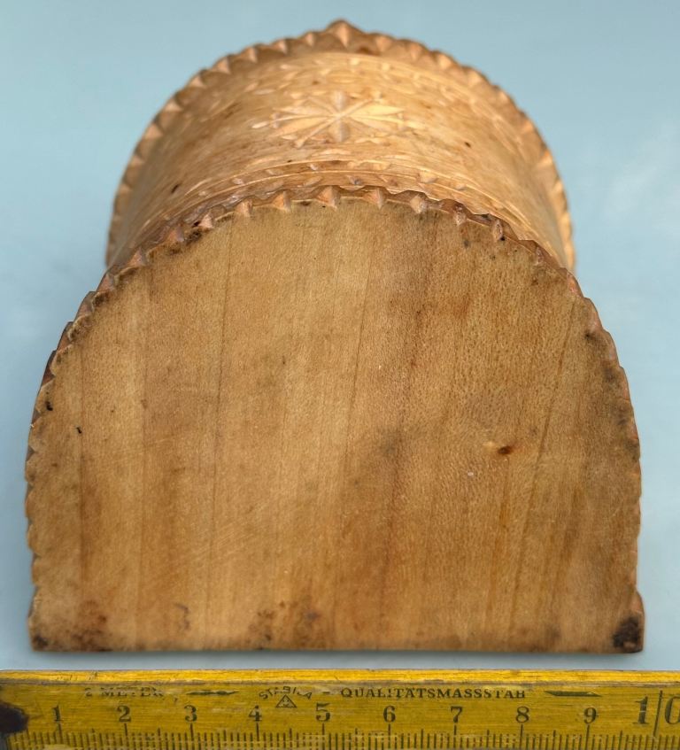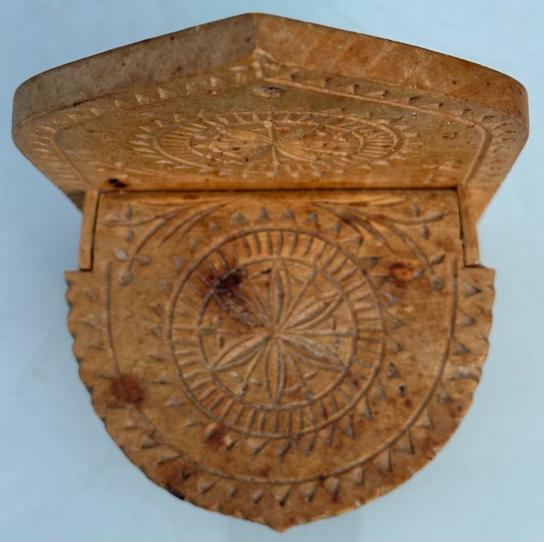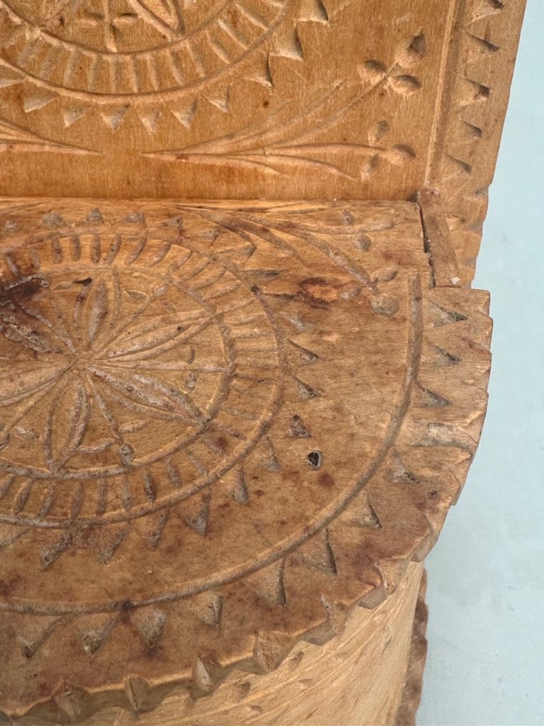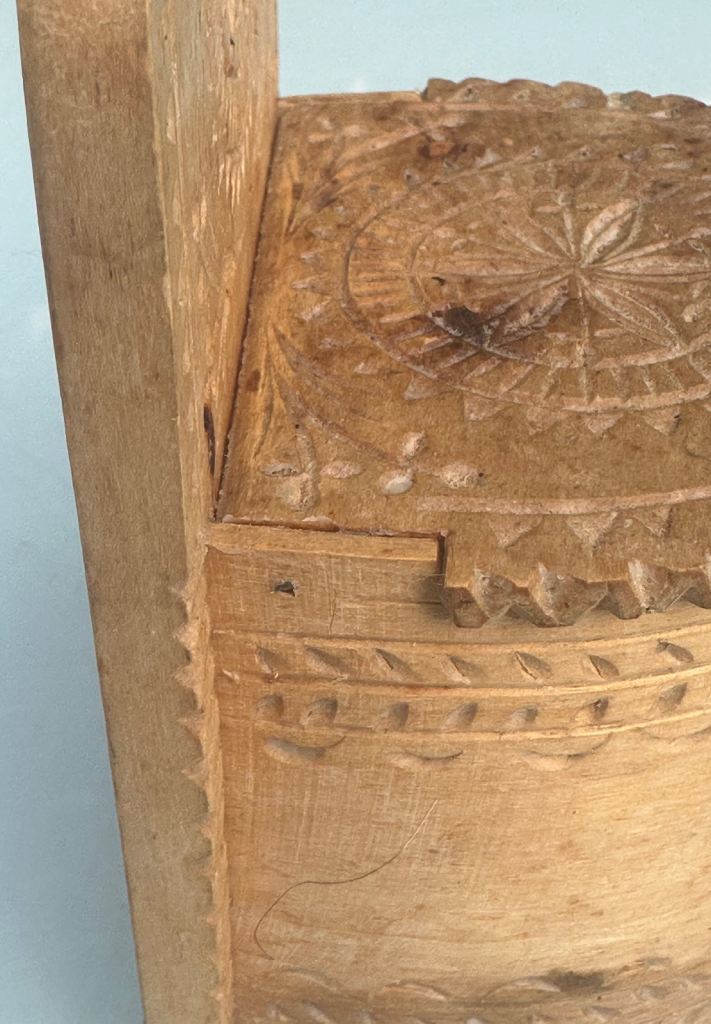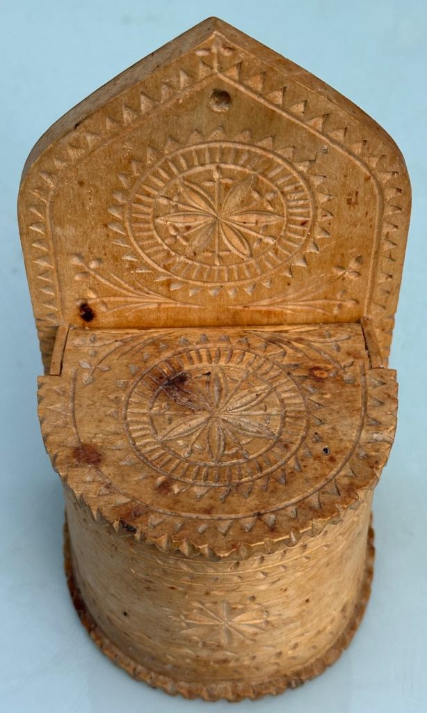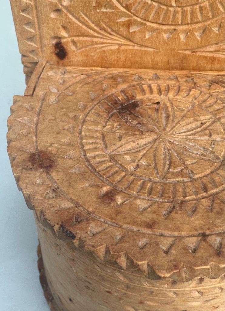 Folk art in style and intricately carved from a lightweight wood, probably Aspen, it has a hinged lid, cut notch for a spoon and untreated surfaces that are now worn and stained but still sound with a nice patina.