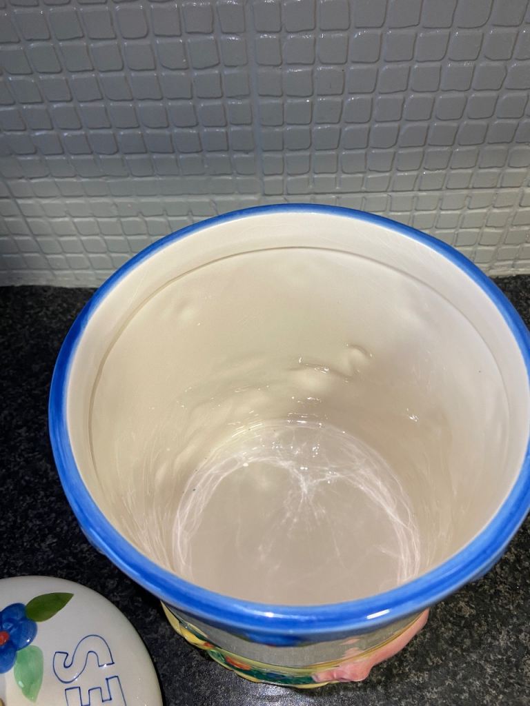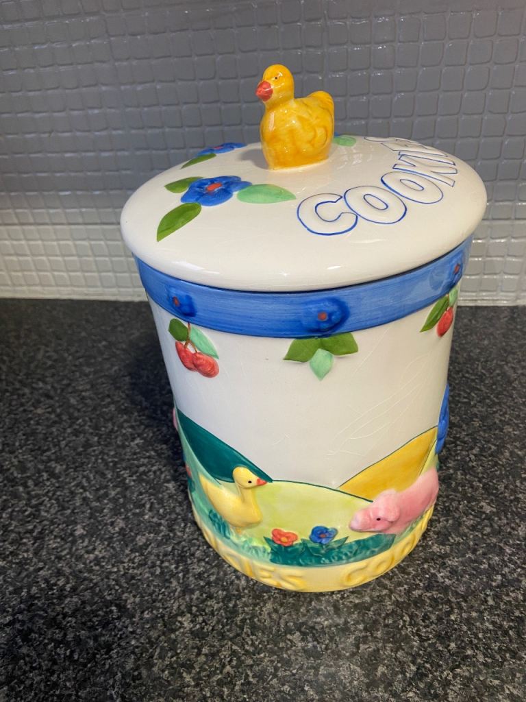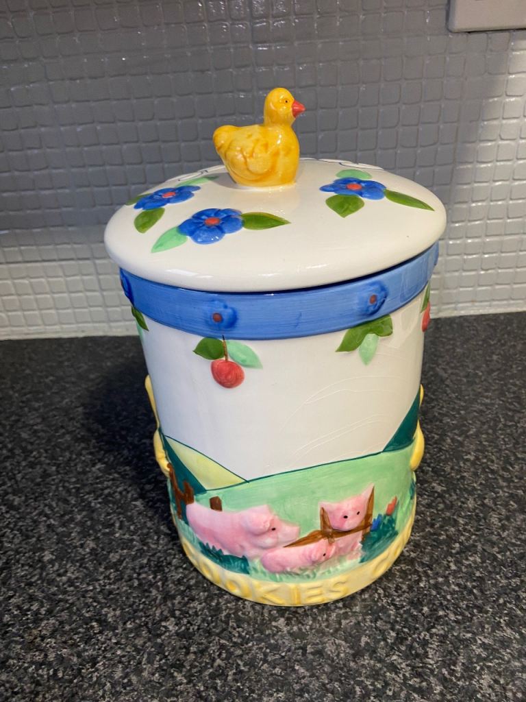 Decorated with a cheerful, hand painted, multicoloured country theme of chickens, ducks and pigs embossed on a rolling countryside backdrop, topped off nicely with a sealed lid with a yellow chick on top for a handle.