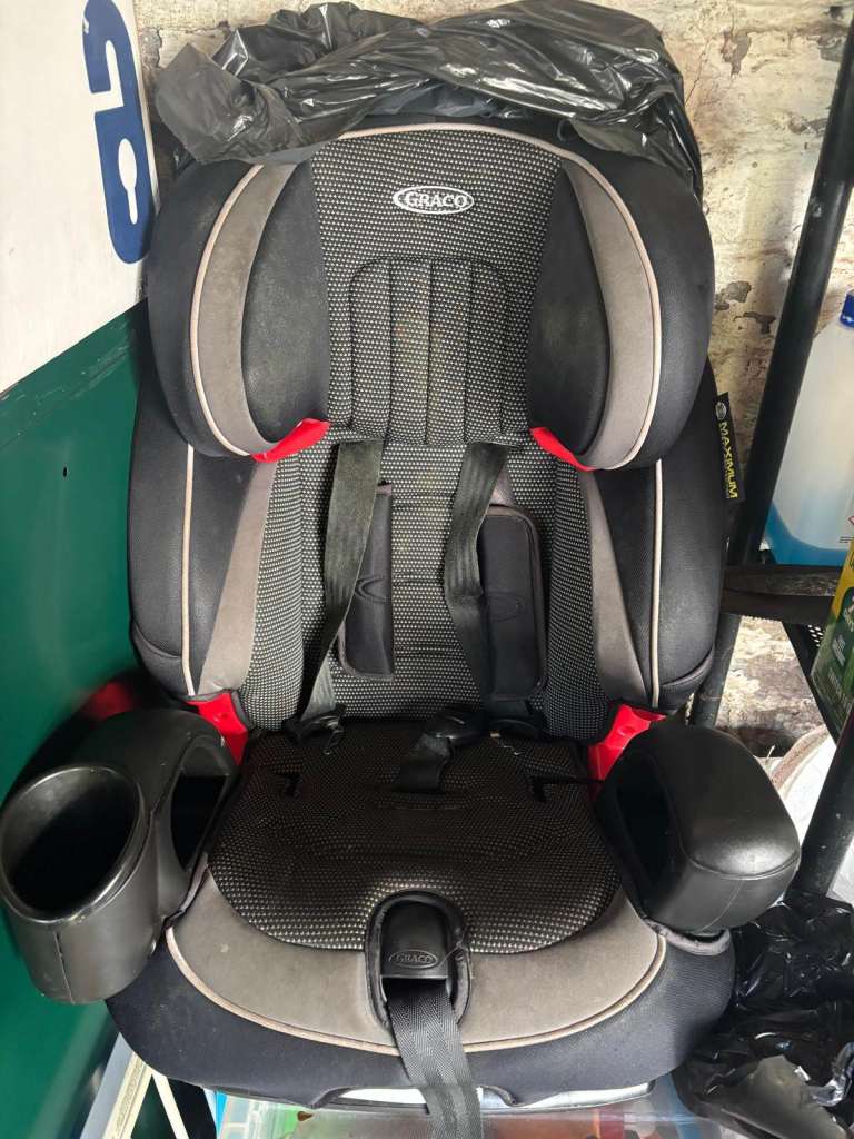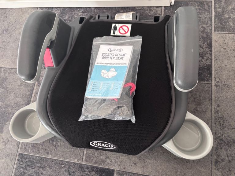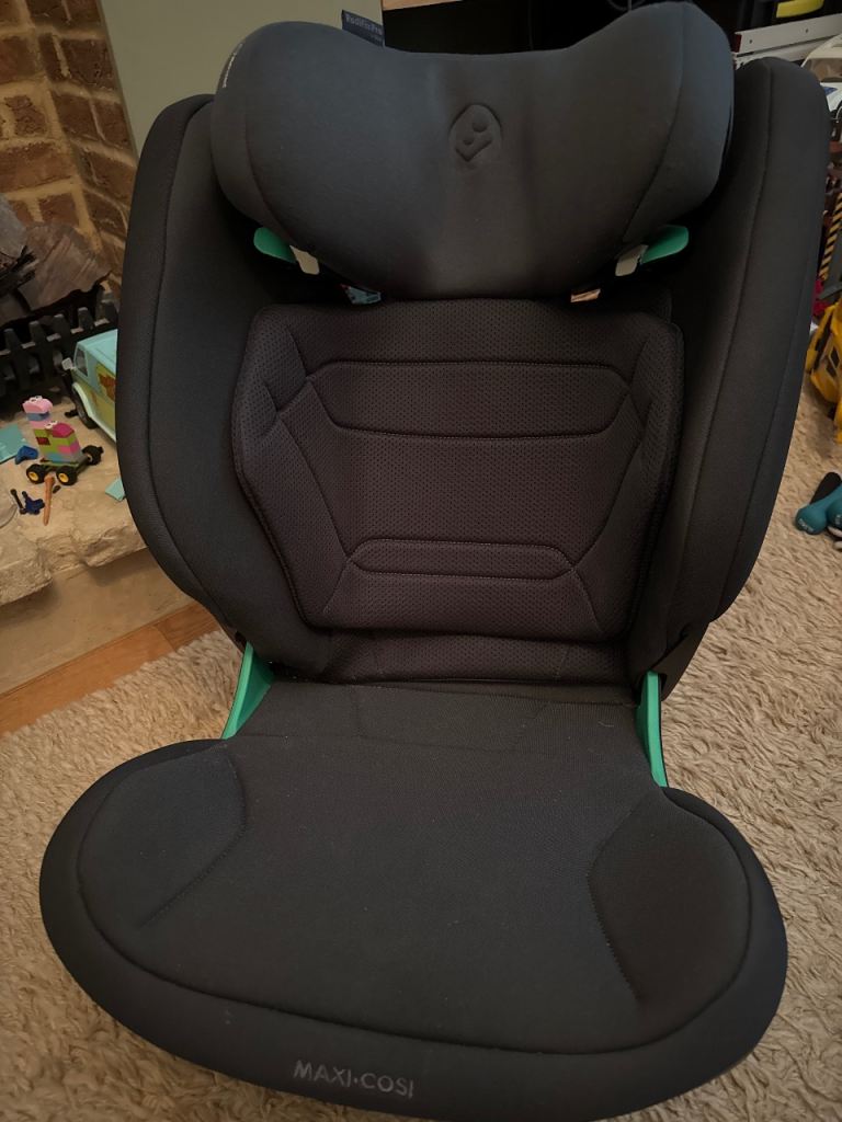 Features adjustable head support and cup holders on each side, very practical for journeys.