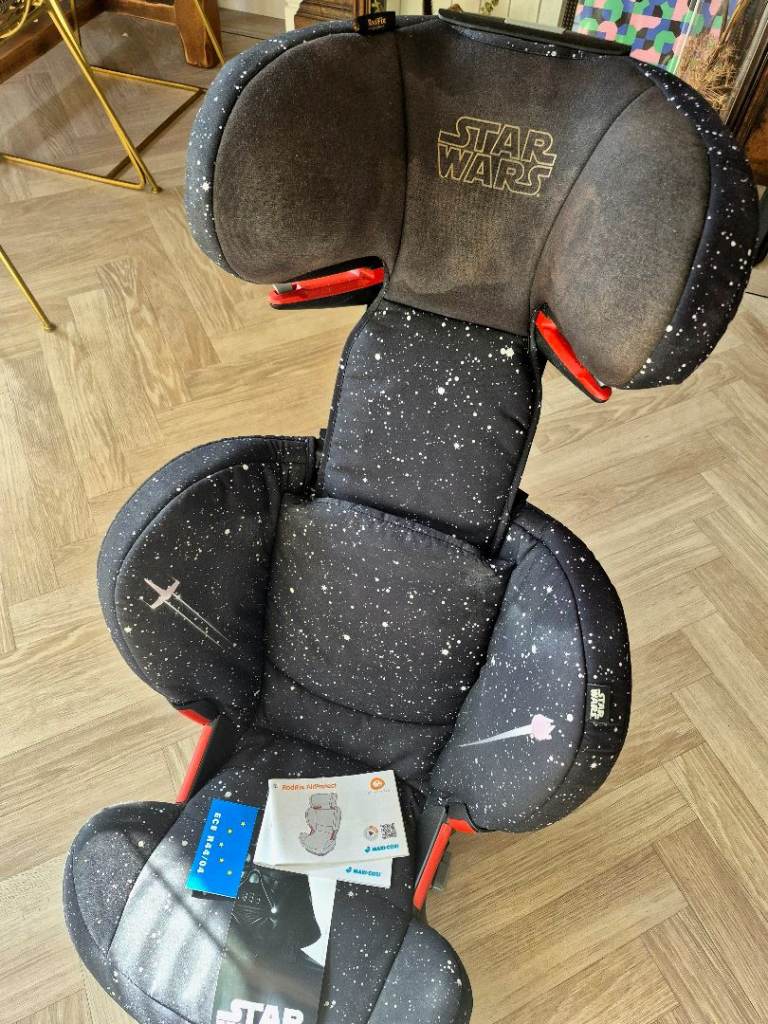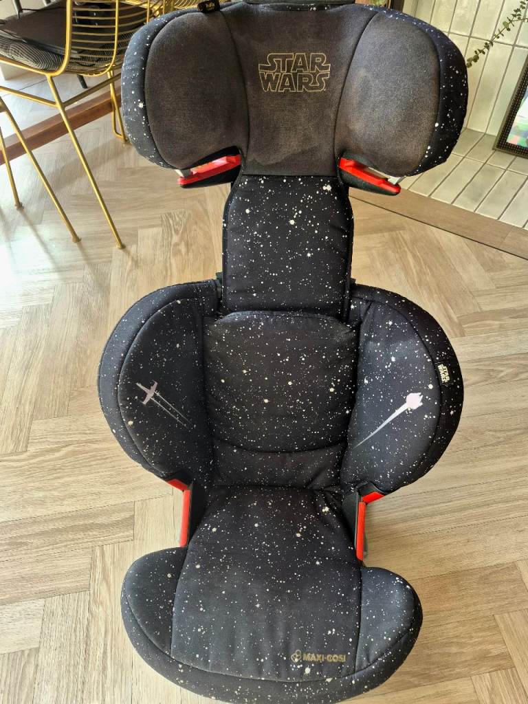 The car seat is in great condition. It has been bought new and it still has the labels. The head rest gas a slight decolorarion.