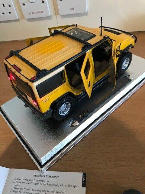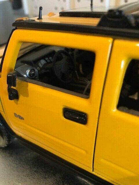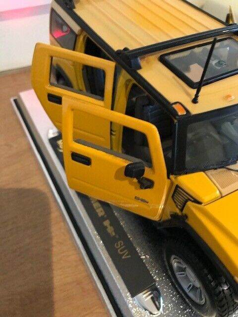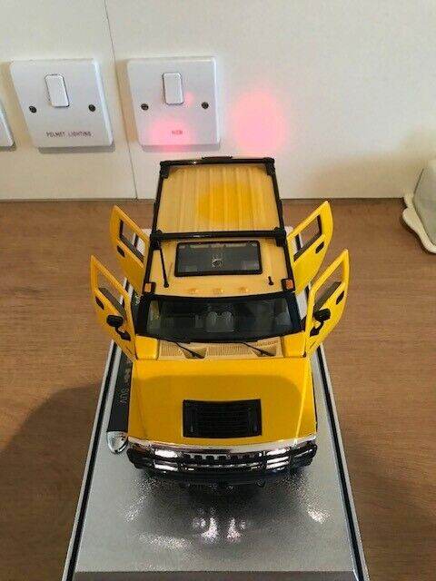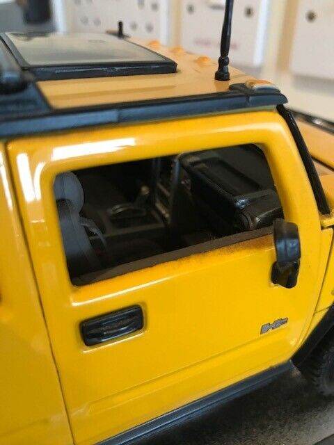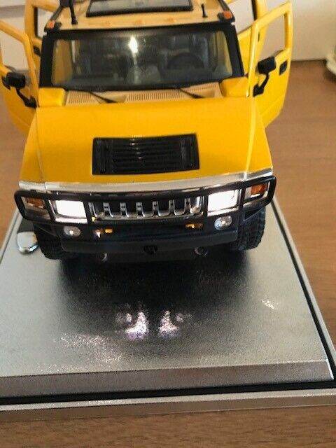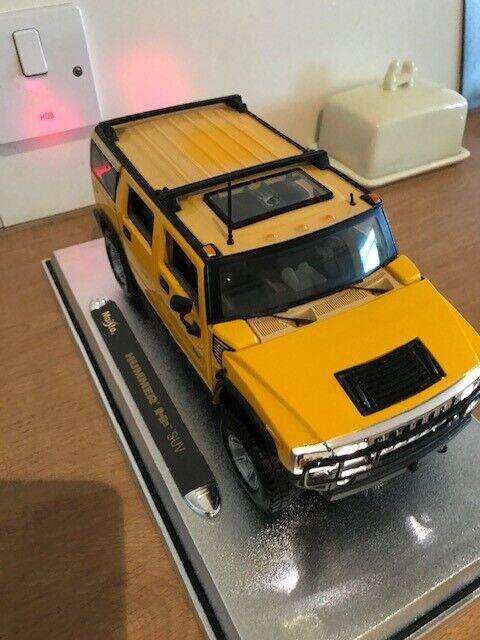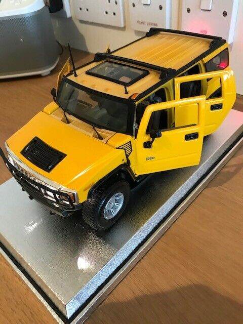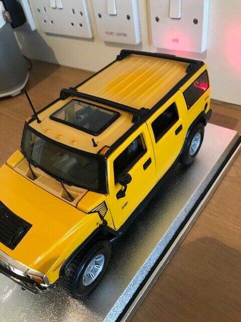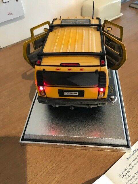I have for sale a 2003 Maisto Hummer H2 SUV Humvee with Infrared Remote Control 1:18 Yellow. It can be taken off the stand a ran remotely, goes quite fast, it also has basic steering. I have inserted new batteries in both the car and remote. Please note that the roof is a bit discoloured - see photos. Everything works but the light button on the remote is a wee bit temperamental but still works fine.