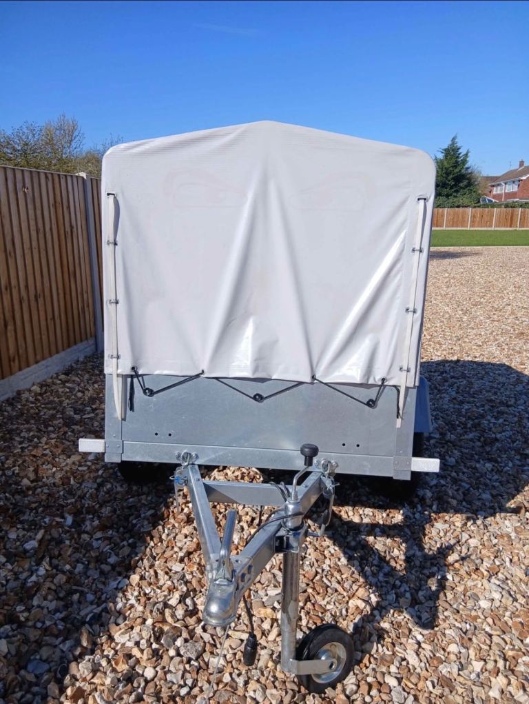 this car trailer is as new condition only used twice in amazing condition new tyres the frame and sheet can be removed back door let's down for easy loading front of sheet open back of sheet opens solid floor trailer also tips for easy unloading size is 5ft long x 3ft 8" wide x 4ft high at highest point it can carry upto 750kg trailer speaks for itself no right up necessary (TRAILER IS AS NEW!) comes with wheel clamp 2 x tow ball locks hitch lock and barrel lock 2 sets of keys for all locks delivery is possible at extra cost depending on distance message for more information COMPLETE BARGAIN!