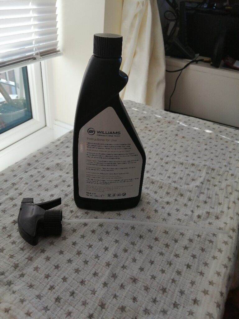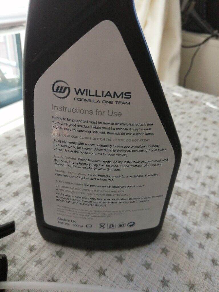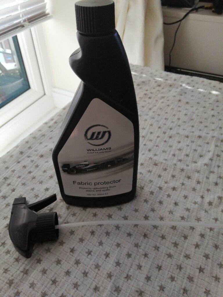 A 500 ml bottle of Williams F1 Team Fabric Protector. Protect your upholstery from stains and spills. Instructions on the bottle how to use, complete with trigger spray attachment. Garage clearance. Downsizing