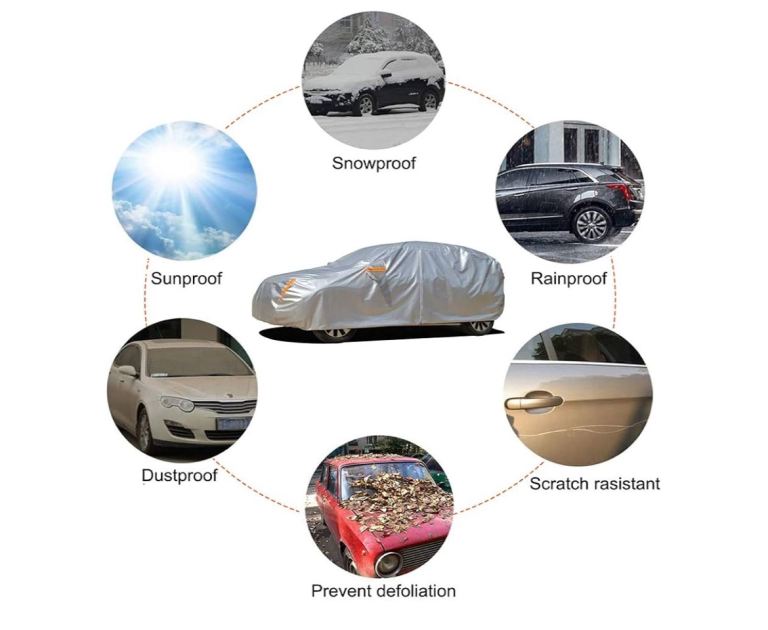 【Premium Material】 - car cover is made of multi layer heavy duty and durable fabric, that will protect your car from extreme weather. ① PE & PEVA is 100% waterproof. ② Aluminum will reflect uv rays and keep the car cool in summer. ③ Soft lining cotton protect car paint better.