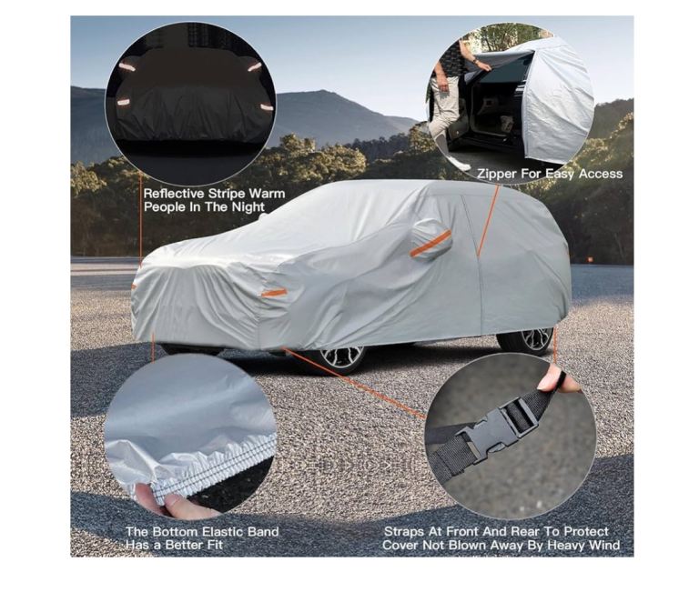 【Professional Design】 - ① With door zip. Easy to get in and out of the car. ② Windproof straps at front and rear. Prevent the auto cover from being blown away. ③ Reflective strips. Remind others at night. ④ Mirror pocket. Keep the cover fit your vehicle better.