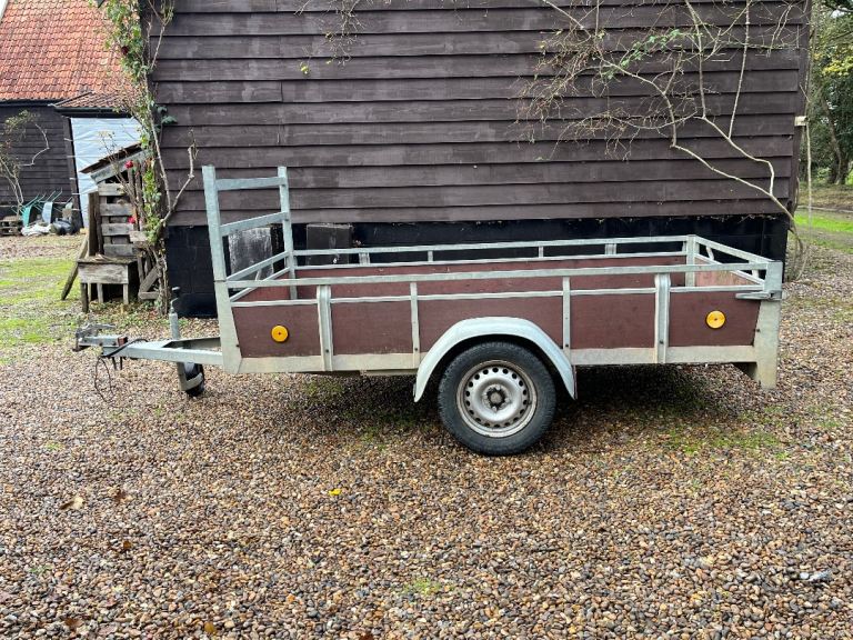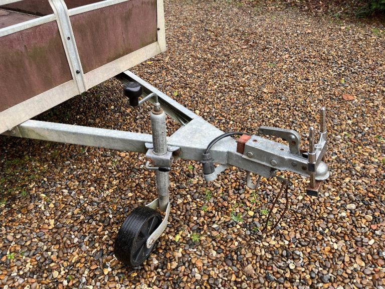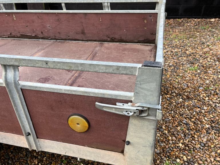 Sturdy galvanised frame with Phenolic board sides, base and drop tail gate. The trailer bed is just over 8’ and the width is just over 4’, meaning an eight by four sheet can be carried with enough finger room to easily remove sheet from trailer. Galvanising is virtually rust free. Base board has two small holes that have been flush filled. Rated at 750kg as it is unbraked, although the trailer will carry heavier loads. A really useful and manoeuvrable trailer.