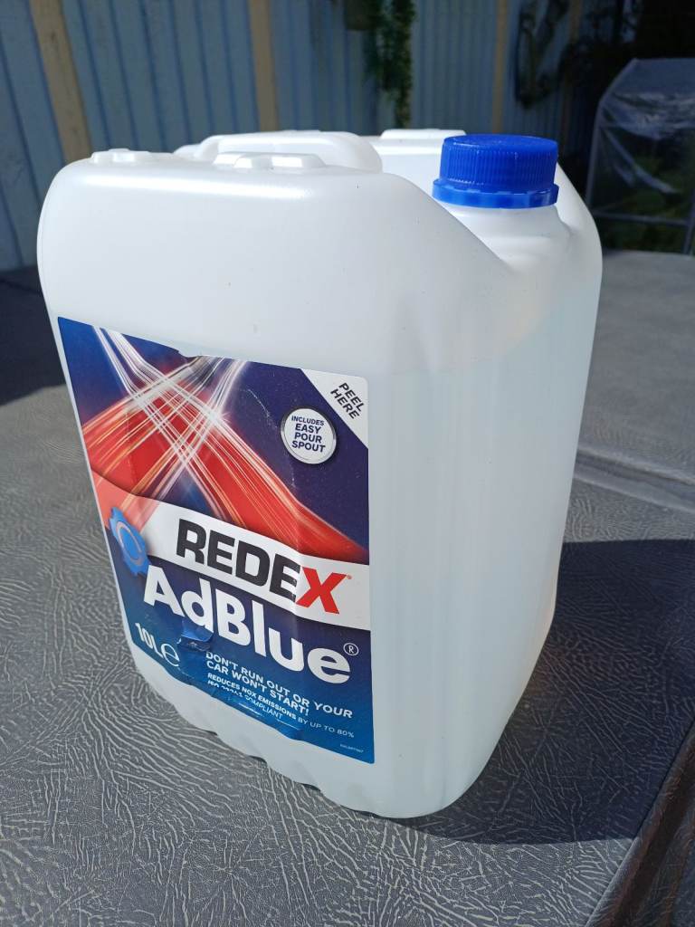 A 10 litre container of Redex AdBlue liquid. The container is still sealed and unopened.