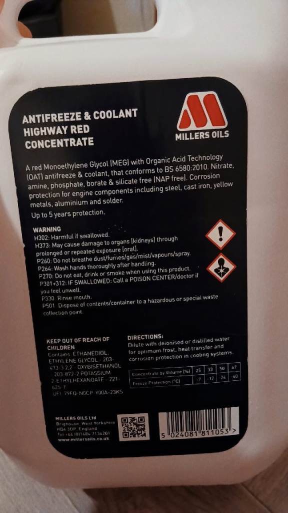 Millers anti freeze for sale brand new can be used for cars, light commercial vehicles, heavy goods vehicles, motorcycles, and machinery cooling systems.