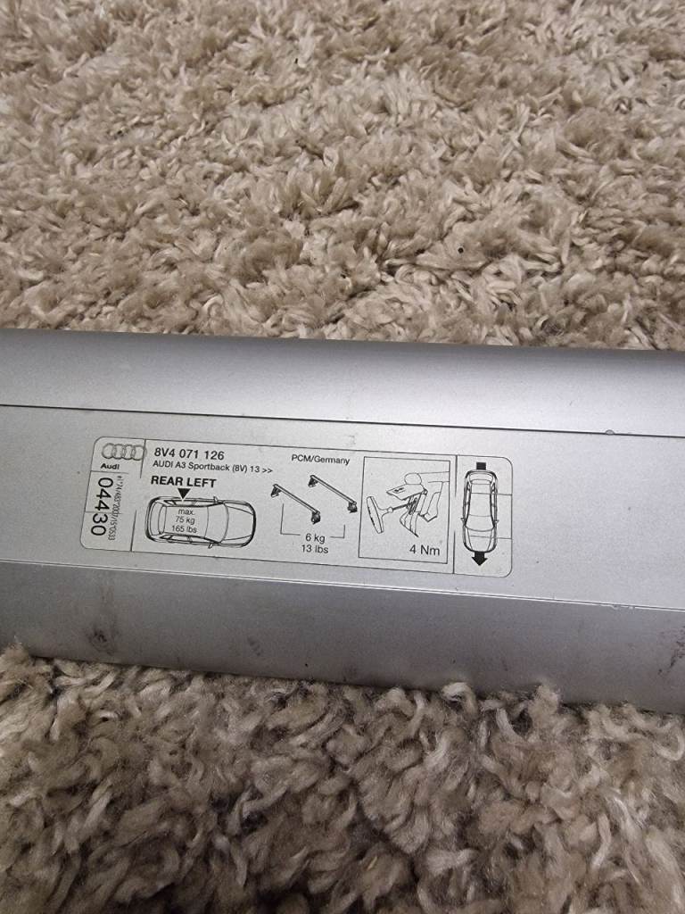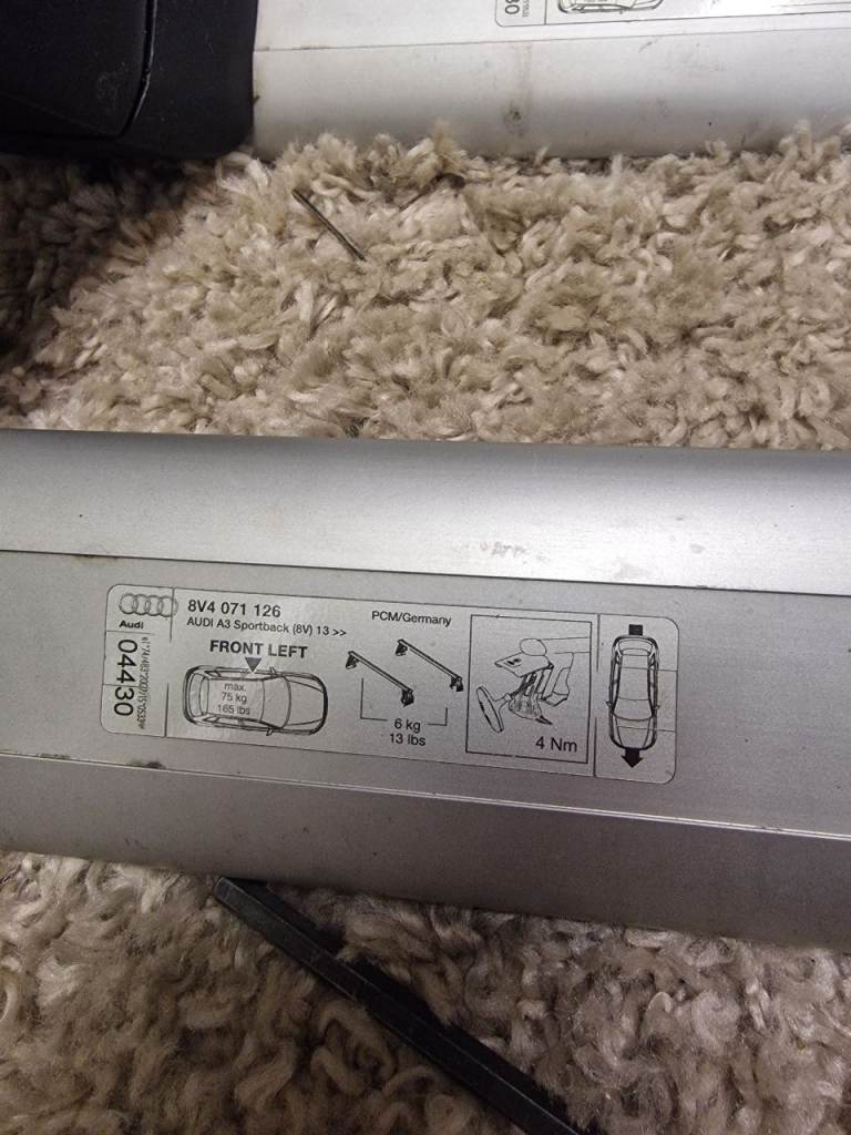 Genuine Audi roof bars for 2012-2020 A3 sportback (hatchback). These are for cars that dont have the factory raised roof rails fitted. All hardware included, 1 key, tool for tightening the feet.
