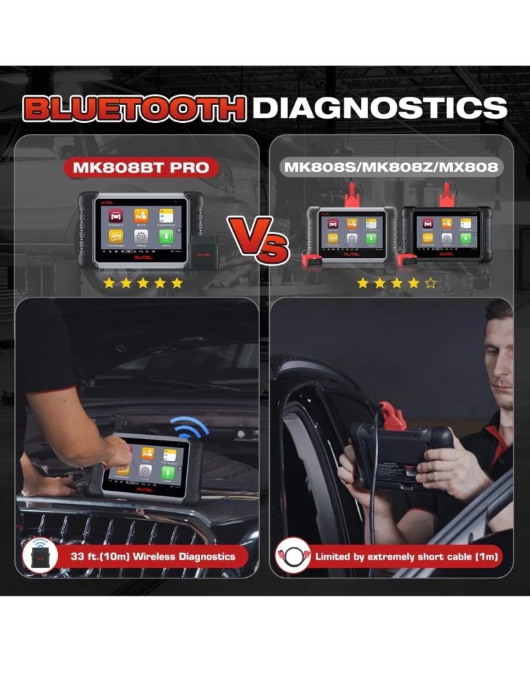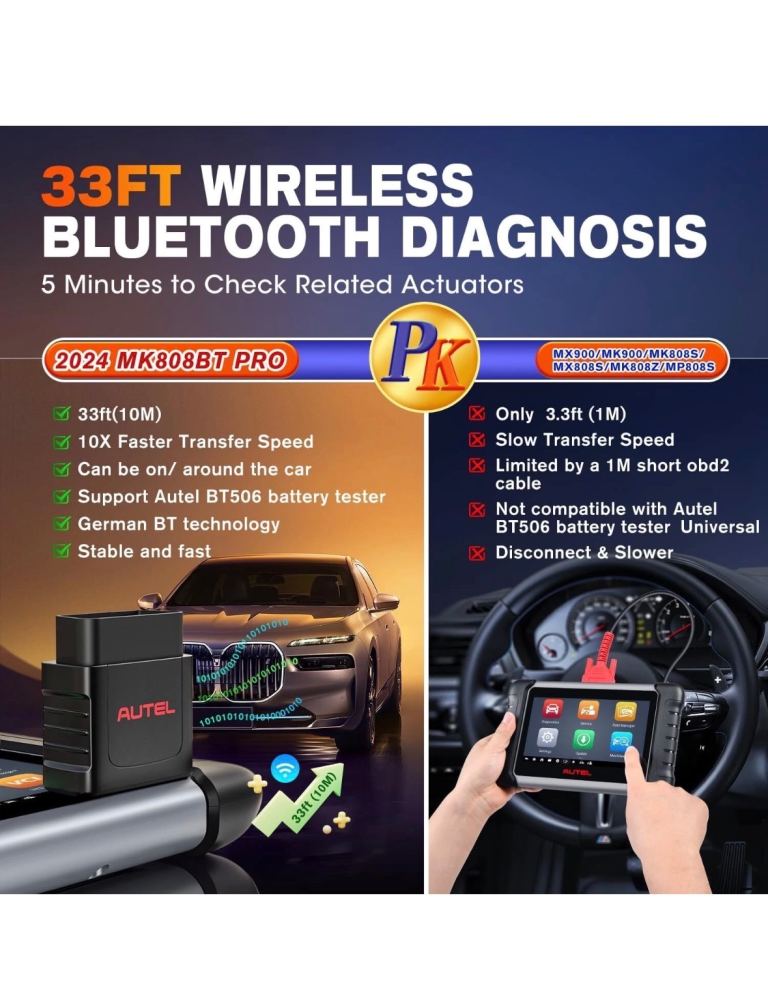In functionality MK808K-BT = MK808BT-PRO, MK808Z-BT, MX900,MK900-BT, better than MK808S/MX808S/MK808Z with wider coverage and more stable & convenient 10M remote Bluxtooth diagnose. Its OE-level all system software integrates 38+ HOT Services, 99% Car Database, 3K+ Active Tests, 5X-faster Hardware and Battery In/Out-Vehicle Test/Starter Test/Generator test(work with BT506),etc.