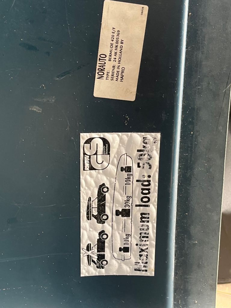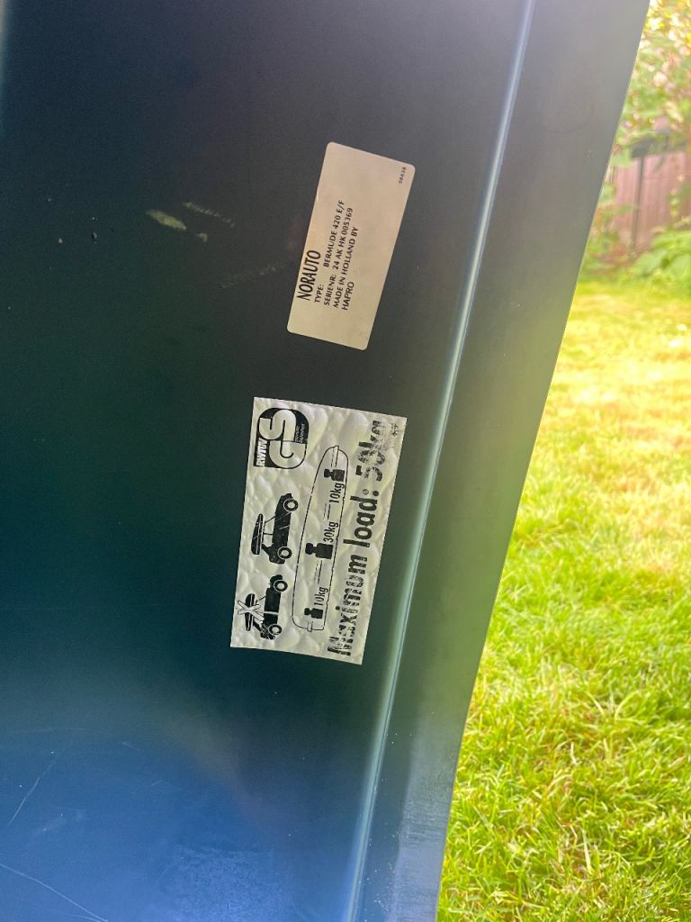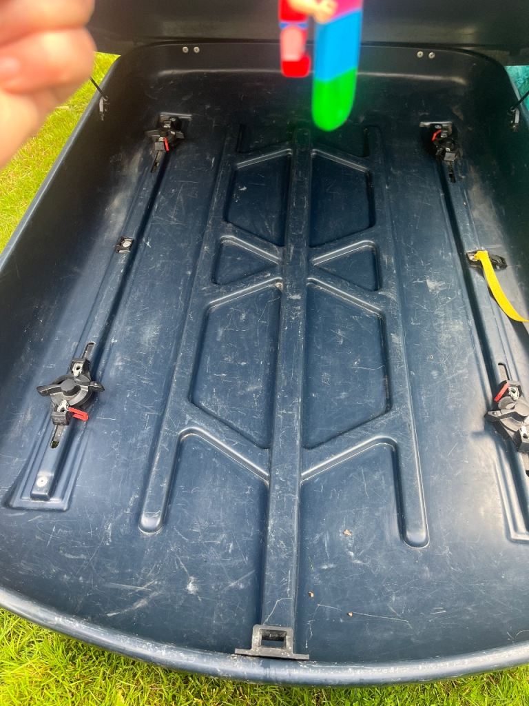 A well used roof box, sturdy, fits a lot in at 420l, max 50kg. 150cm length and 100cm width. We had it on a Qashqai and it fit perfectly. Metal clips fit on roof bars max 7cm width!