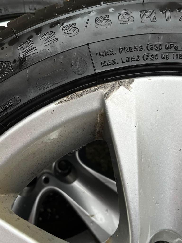 4 BMW 17" Winter wheels with Dunlop Winter Sport 4D 255/55R17 97H run flat tyres. Slight damage on two of the wheels see photos. The tyres are in very good, almost new condition and all have at least 6mm of tread left. Previously fitted on a 2013 BMW 530D Touring. Also comes with tyre stand.