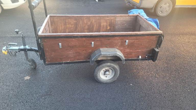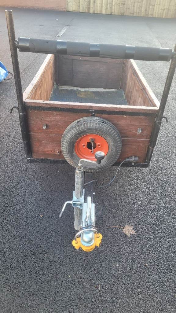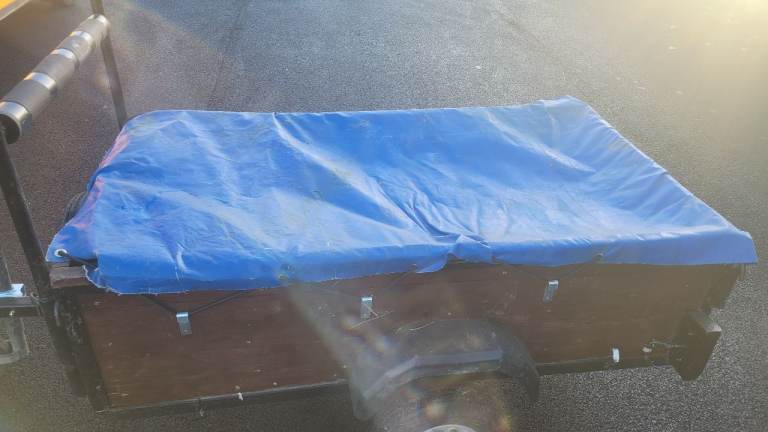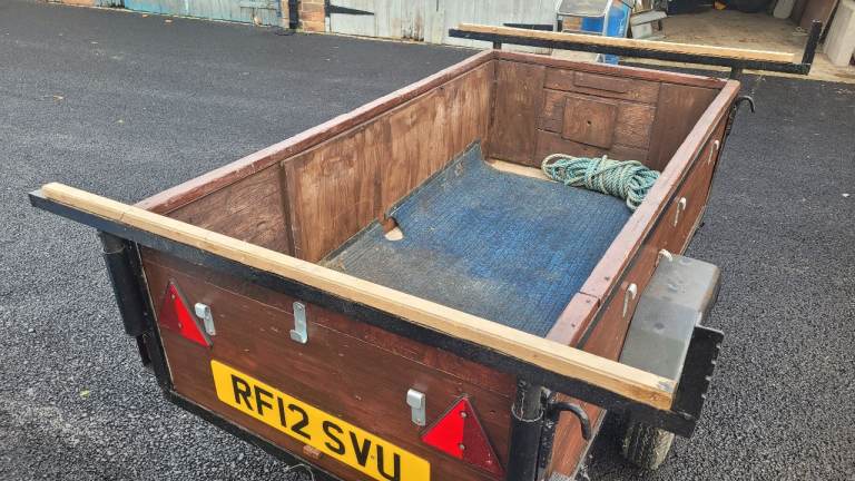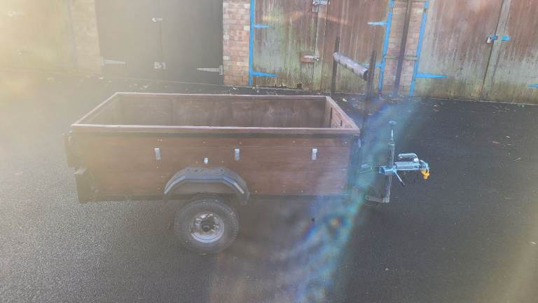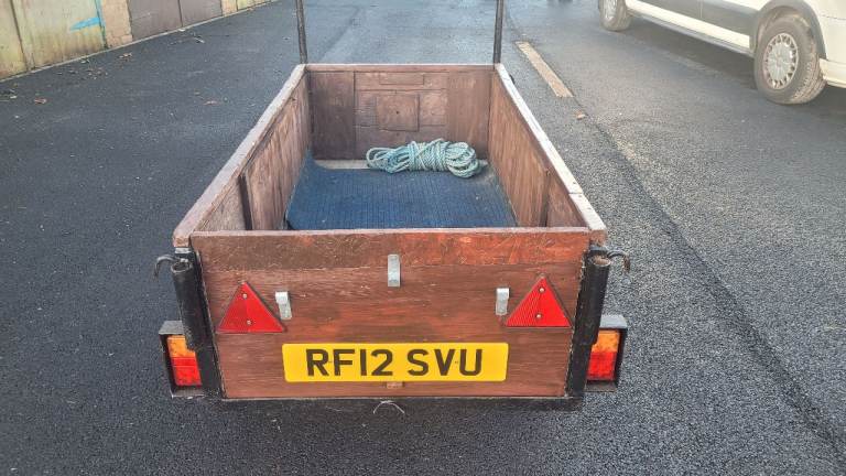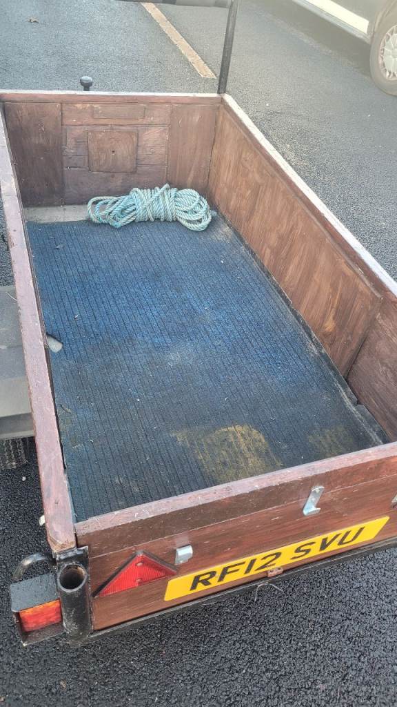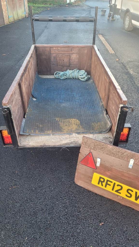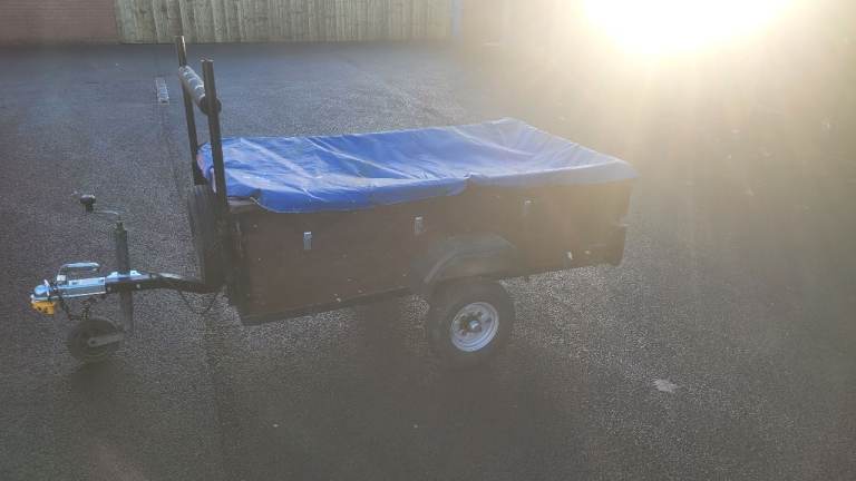 Box trailer, 3ft x 5ft 7", good strong trailer, has removal attachments to carry flat wooden boards, good tyres and wheel bearings, L.E.D lights, jockey wheel, tarp cover.