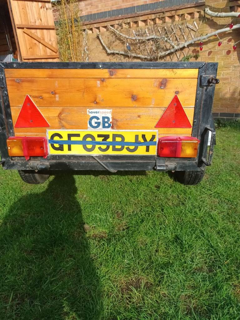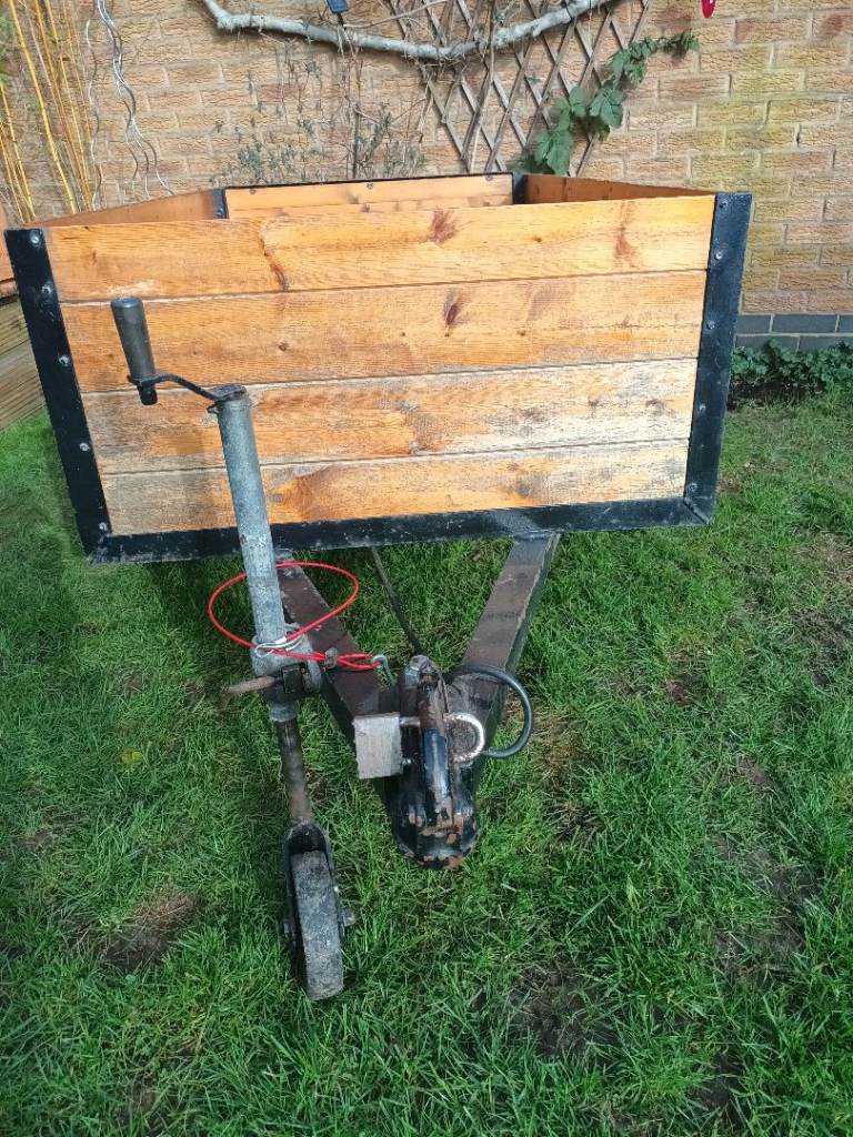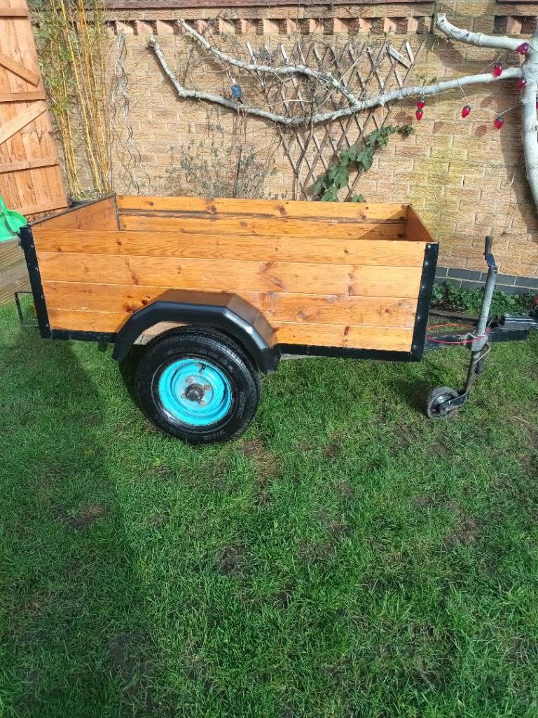 Wooden Box Trailer with Jockey wheel 5ft x 3ft x 17 inches deep. Good condition, kept under cover. Good Tyres. Drop down rear.