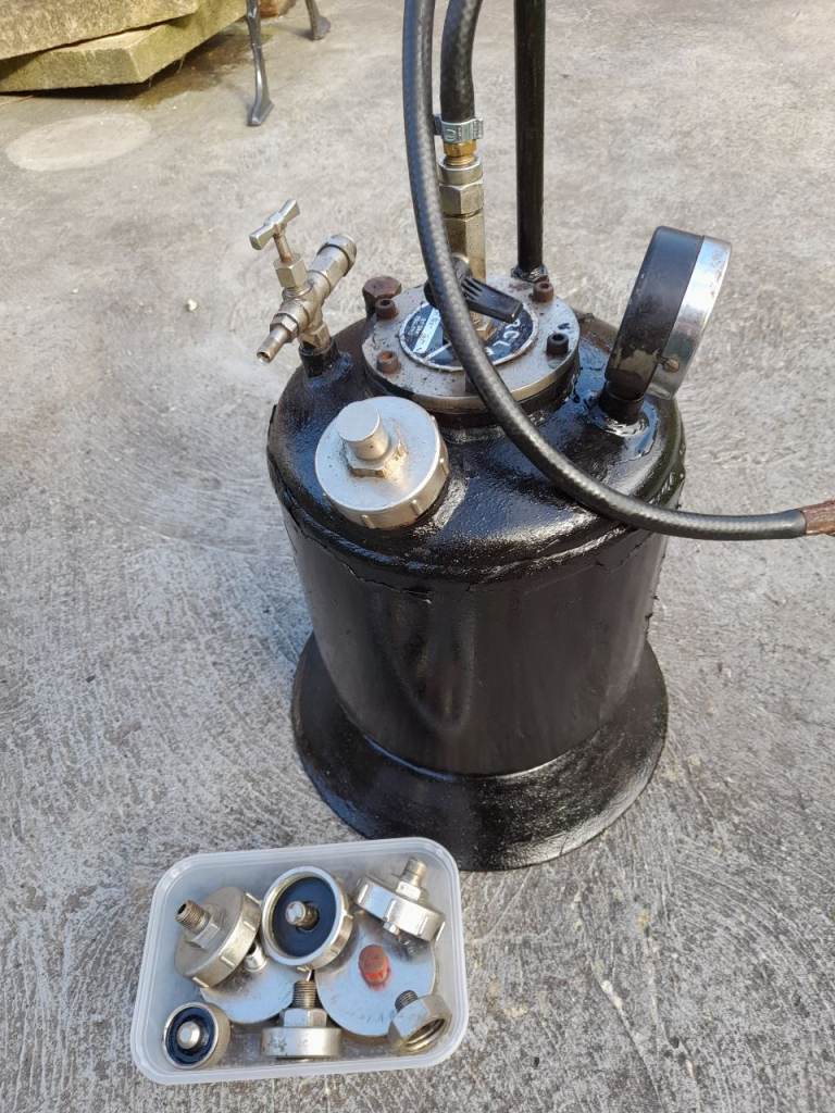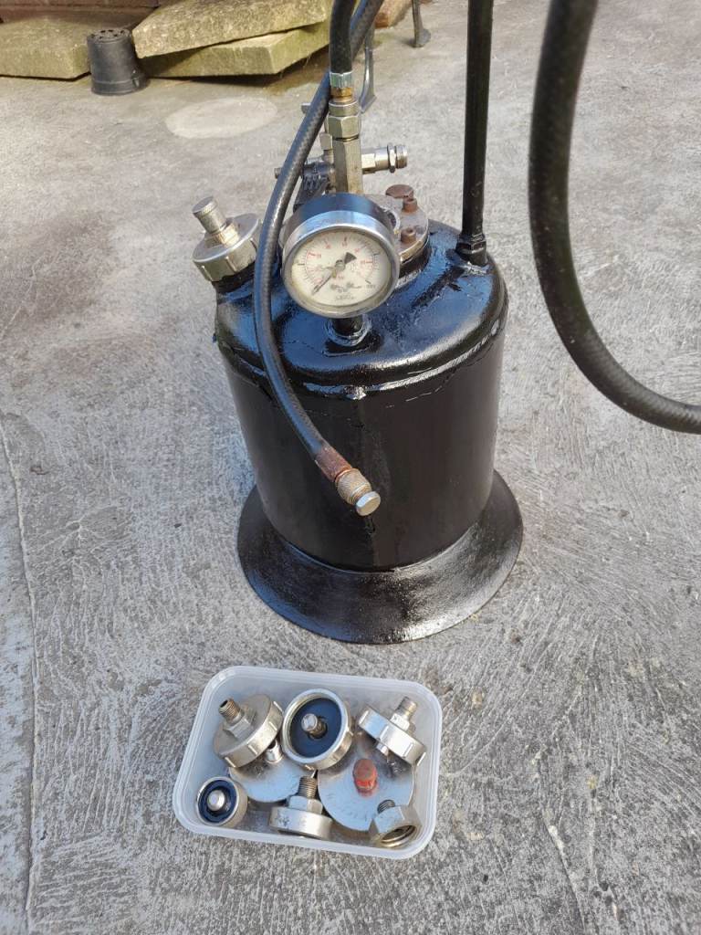 Pressure brake bleeding tool requires new hose has many m/c fittings good for small business buy to collect