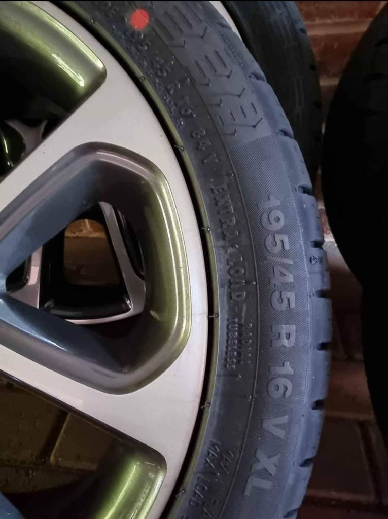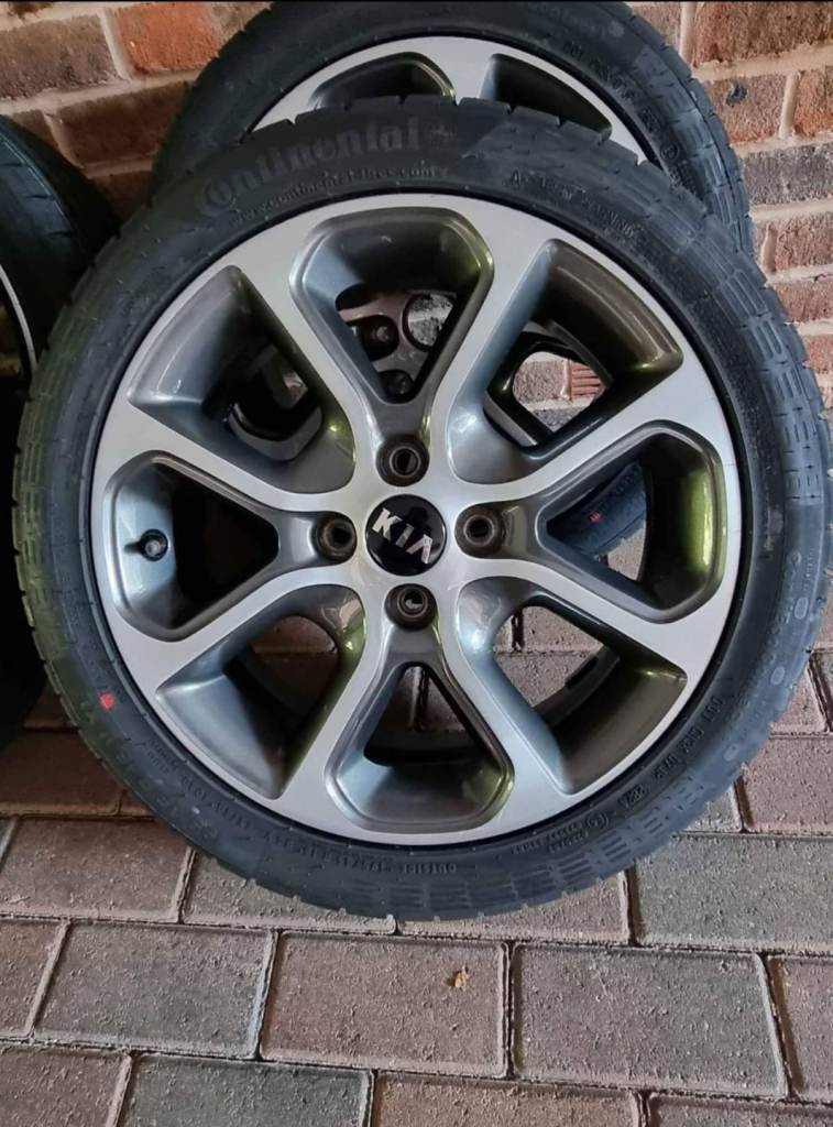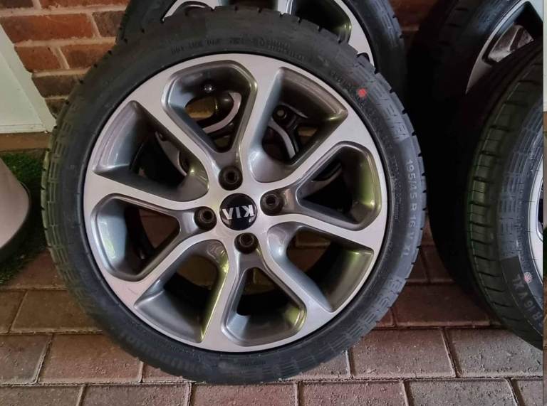 For sale is a genuine set of 4 Kia alloy wheels fitted with brand new Continental tyres (195/45 R16 XL).
