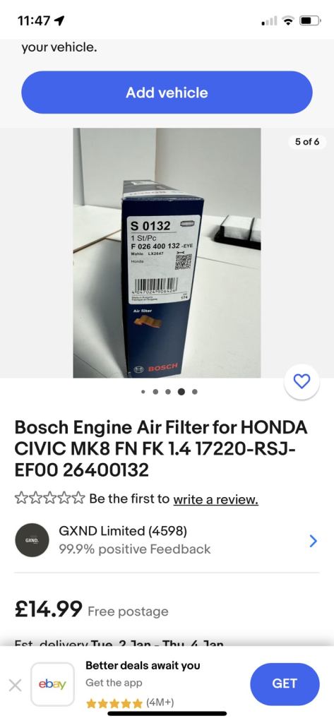 Brand new Bosch engine air filter for Honda Civic MK8 FN FK 1.4 17220 -RSJ-EF00 (2 available),