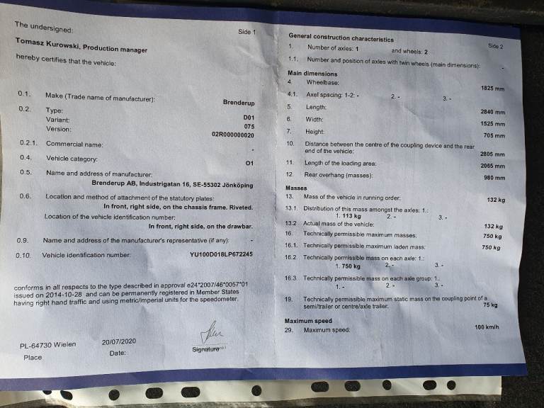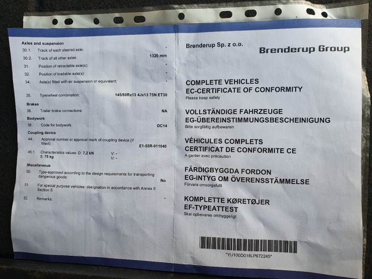 Brenderup 750kg Motorbike Trailer In excellent condition, on 13-inch wheels with very good tyres and bearing, comes with, unused spare wheel, loading ramp, jockey wheel,Certificate of Conformity, safety cable and working lights with 13pin plug Viewing. Viewing welcome