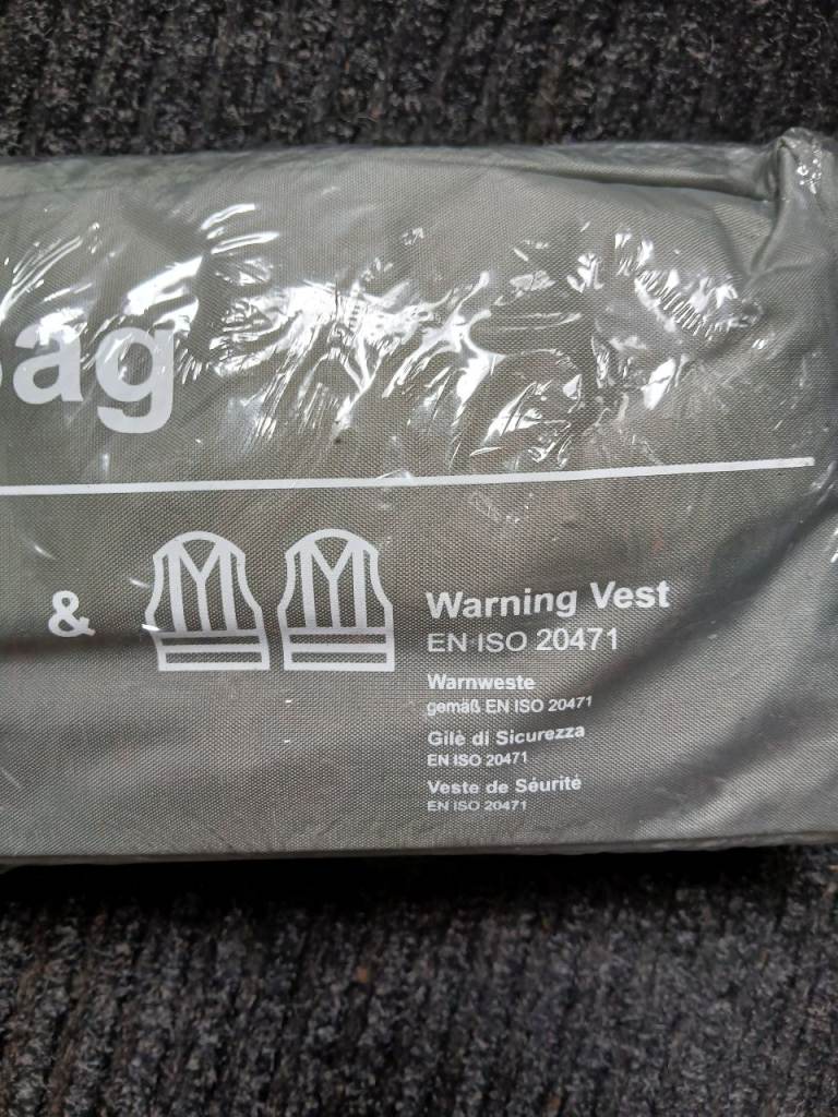 This is a great kit to have in your car. It comes with a Warning triangle, 1st aid kit and Hi viz vests.