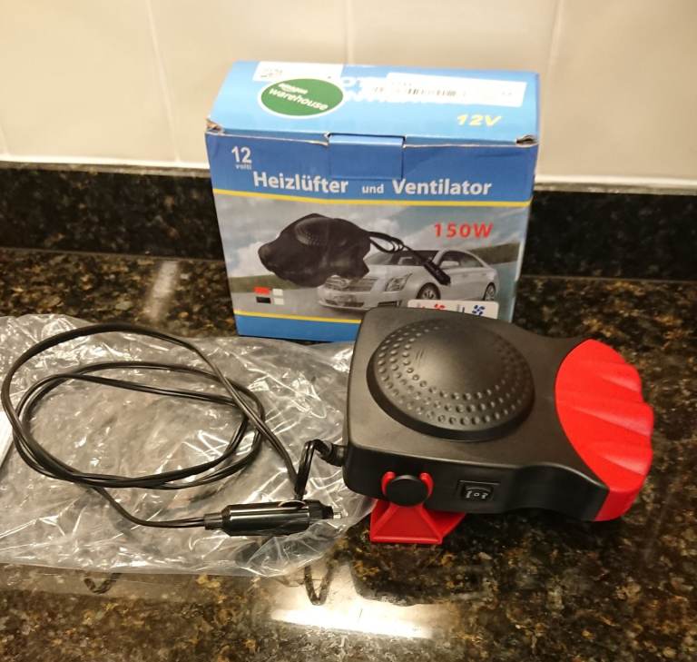 This is a 12-volt car heater and fan. It is designed to quickly heat or cool the interior of a vehicle by plugging into the car's lighter socket.