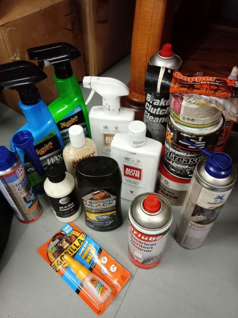 Brake cleaner, electrical connectors cleaner, glue, leather cleaner, polish wax, bumper wax, copper and lithium grease, leather paint.