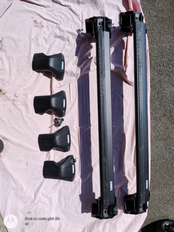 Thule car roof rack system suitable for vehicle roof without rails, rain gutters or fixed points.Lockable with two keys, and a torque (assembly) key. Dimensions: 104cm and 95cm