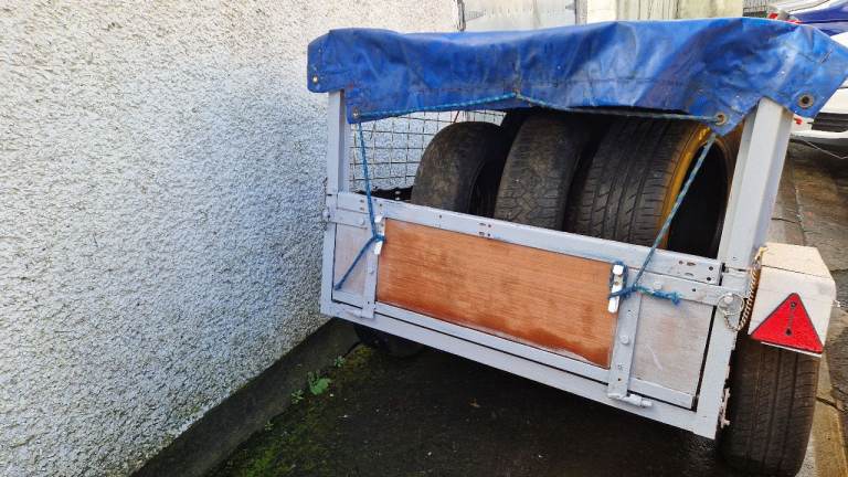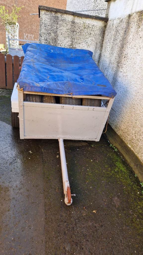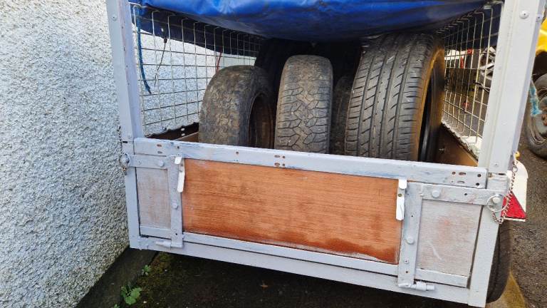 Car trailer for sale, 43" wide x 61" long, sides 30" high, excellent wee trailer for gardening etc, comes with cover, tailgate clips fitted.