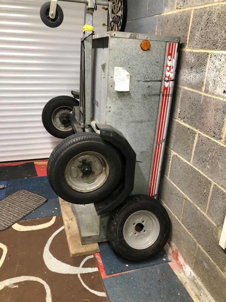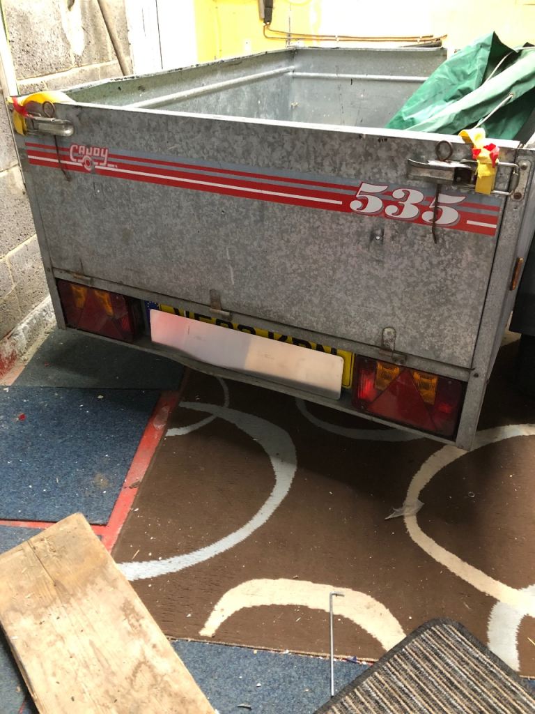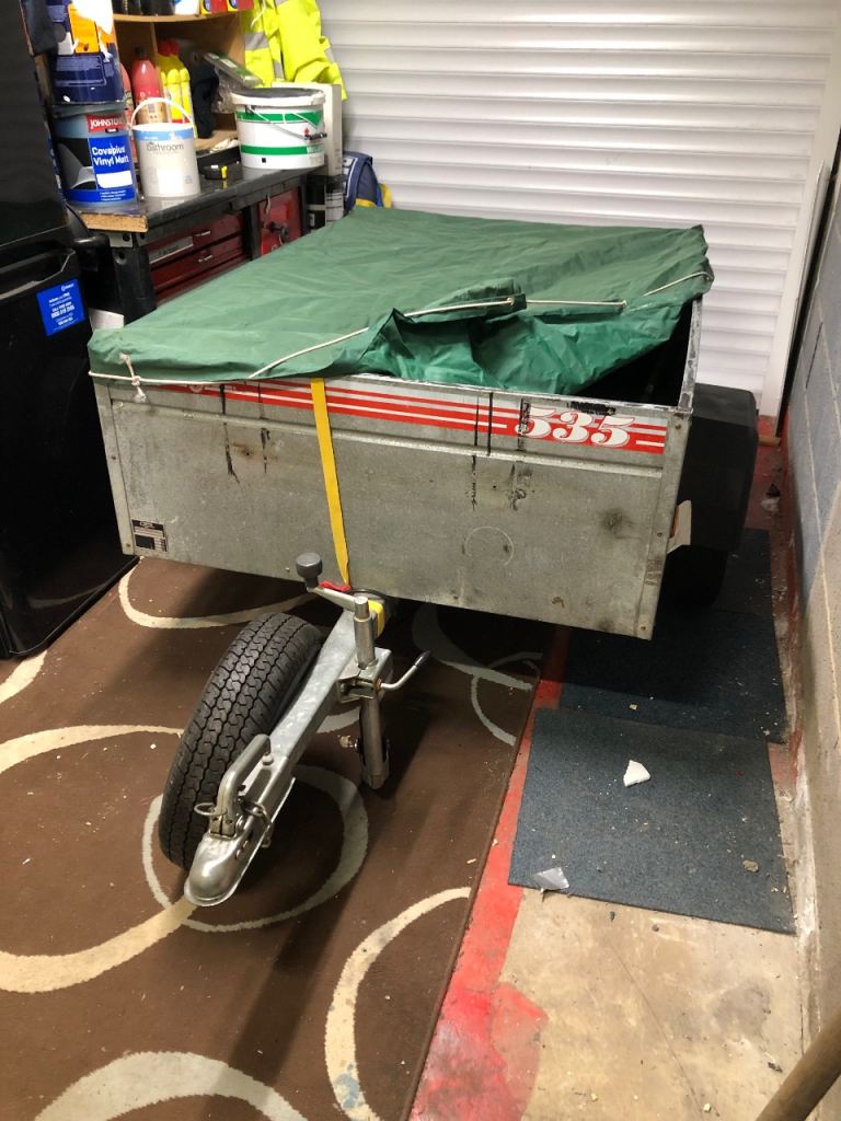 Caddy 535 trailer, 5x3 ft with jockey wheel. Can be stored upright. 500kg