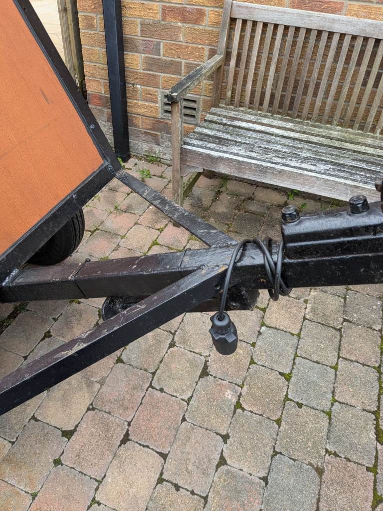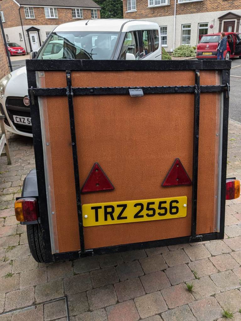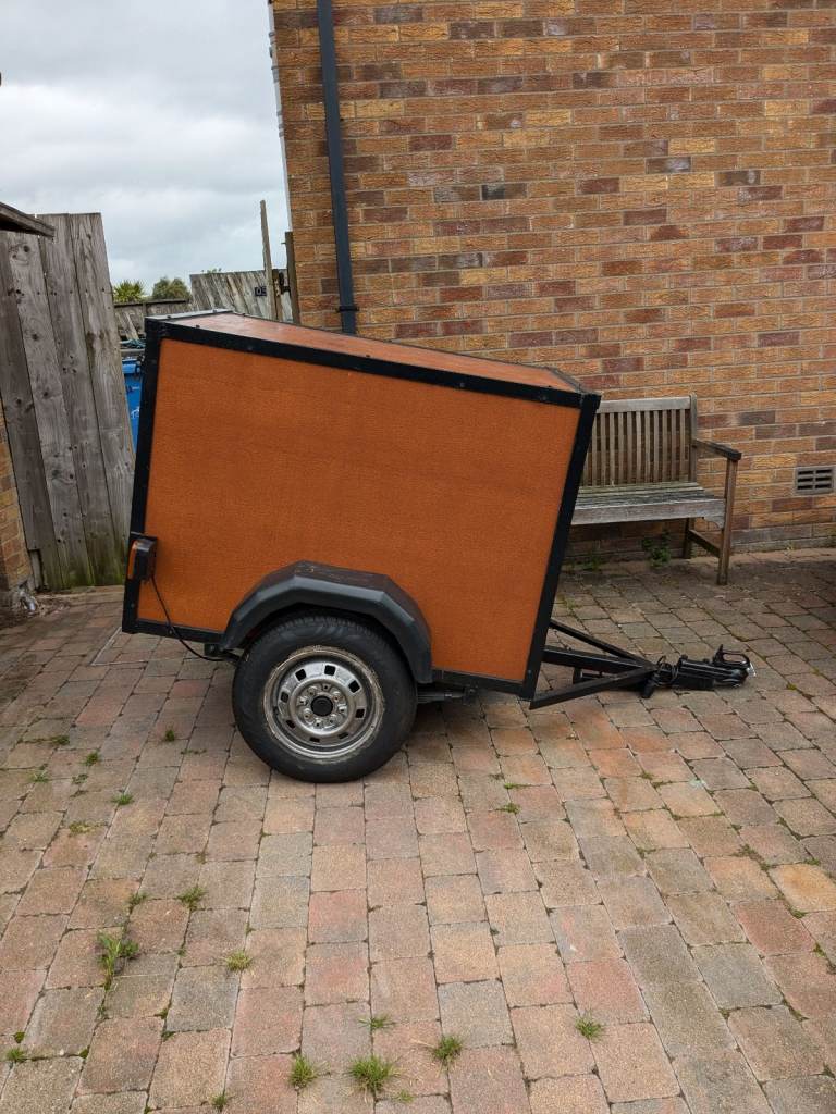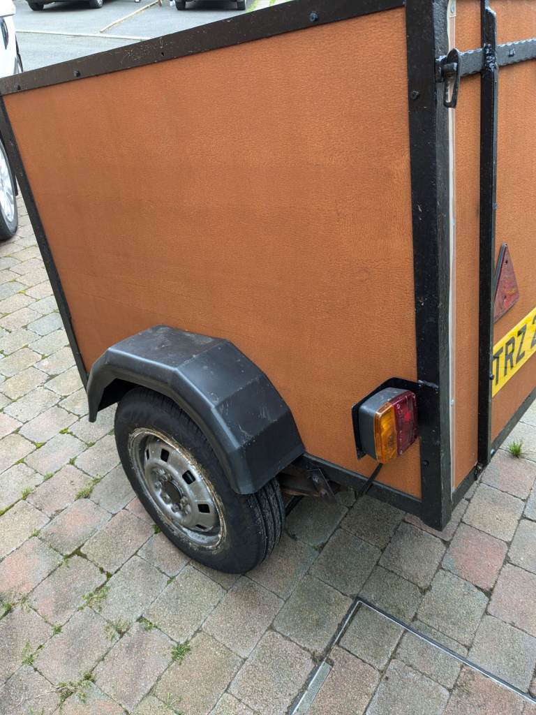 Hi. This is a box trailer with metal frame and marine ply wood panels. It has full electrics and tow hitch. Back drops down for access and is lockable. Would be good for dog transportation or gardening equipment.