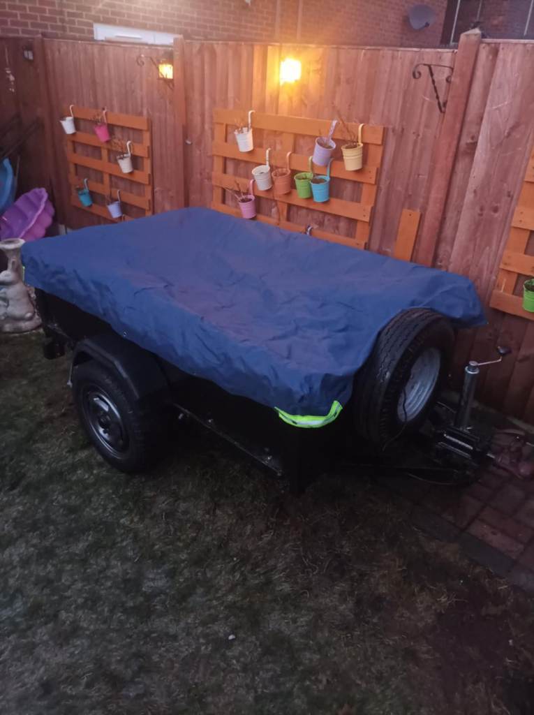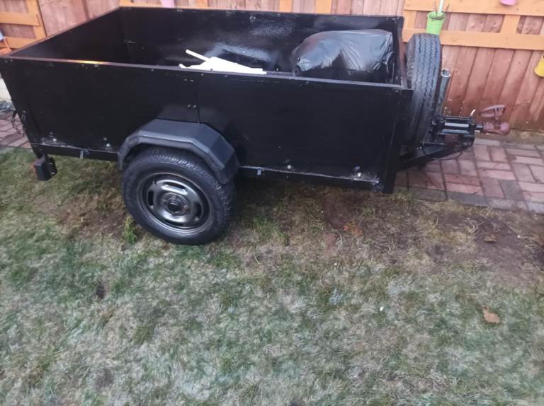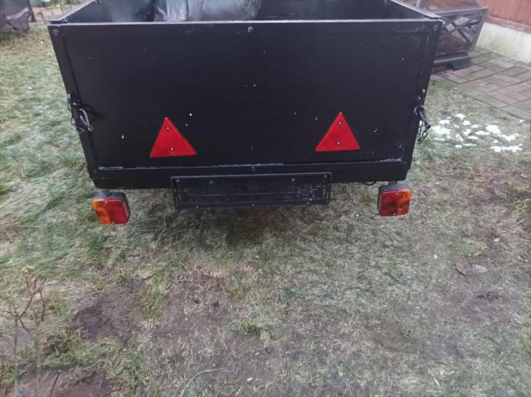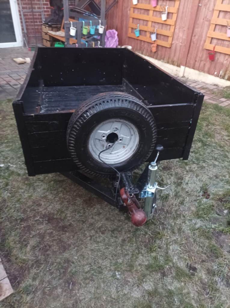 For sale: a car trailer for the plot, camping, fishing, or for tidying up around the house or after renovations. It's been refurbished and repaired for my use, but I bought a smaller one so I don't need it. Dimensions: 160 cm x 100 cm, new floor, removable tailgate, working lights, new wiring, spare tire, new tarp, new wheel with a lifting lift. My price is 250 pounds, negotiable.