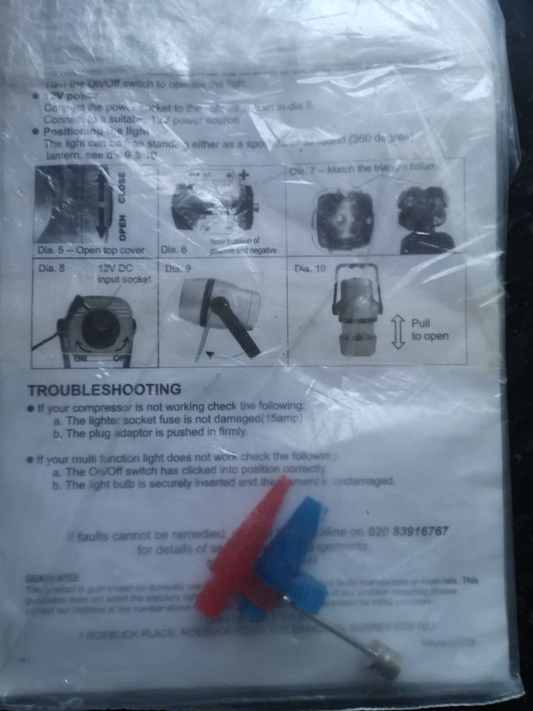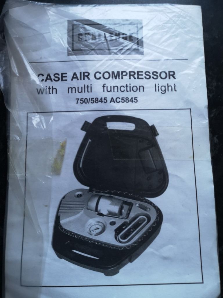 Heavy Duty Challenge Case air compressor with multi function light and instruction booklet (SPARES/REPAIRS). PLEASE READ THE DESCRIPTION BEFORE MESSAGING. The compressor and the lantern are powered via cigarette lighter. They have not been used for sometime. The lantern works. The inflater has power but keeps coming off when connecting to the tyre. You cannot inflate tyres with it as it is now. Selling as spares/repairs. Cash on collection ONLY. Last price is £10.