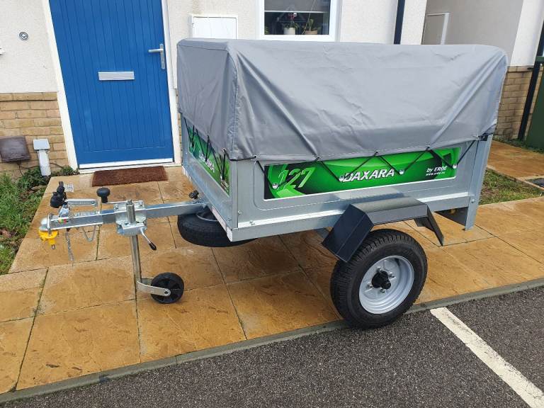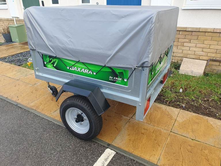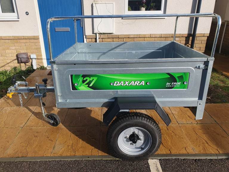 Daxara 127 Trailer in excellent condition with tipping function and rear tailgate, on 10-inch wheels with very good like new tyres and bearing. Comes with high frame and cover that doubles load capacity, spare wheel and bracket, jockey wheel and bracket, safety chain, Certificate of conformity, 2 x hitch locks, and working lights with 7pin plug. Viewing welcome