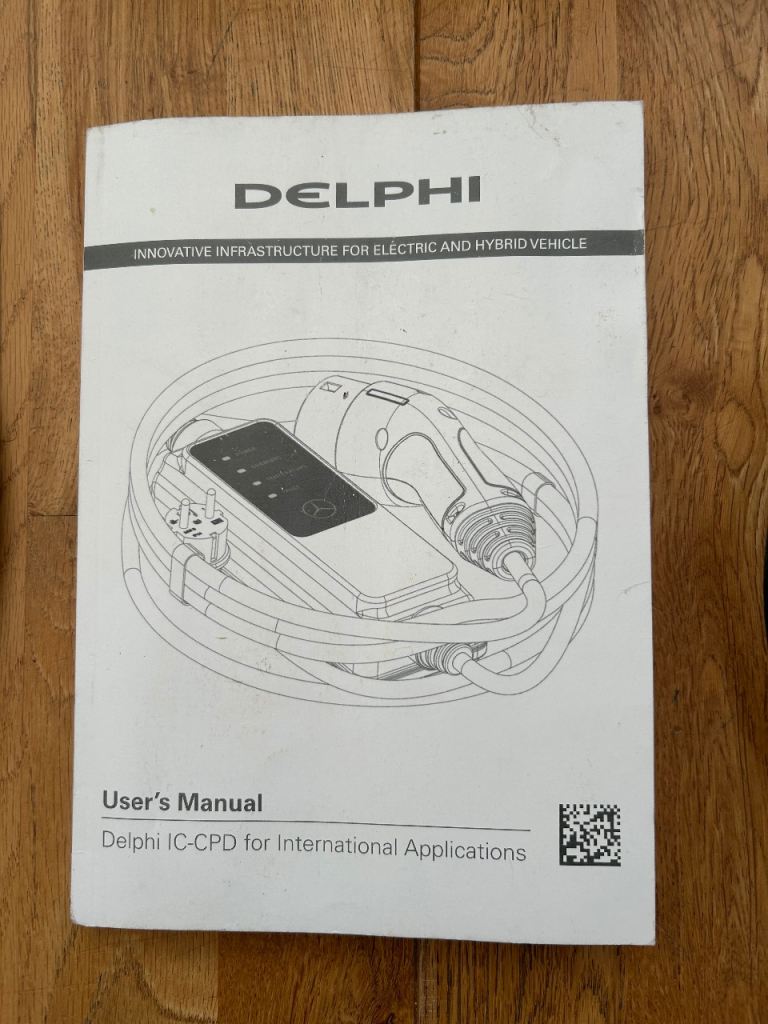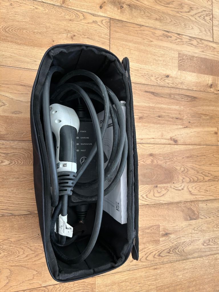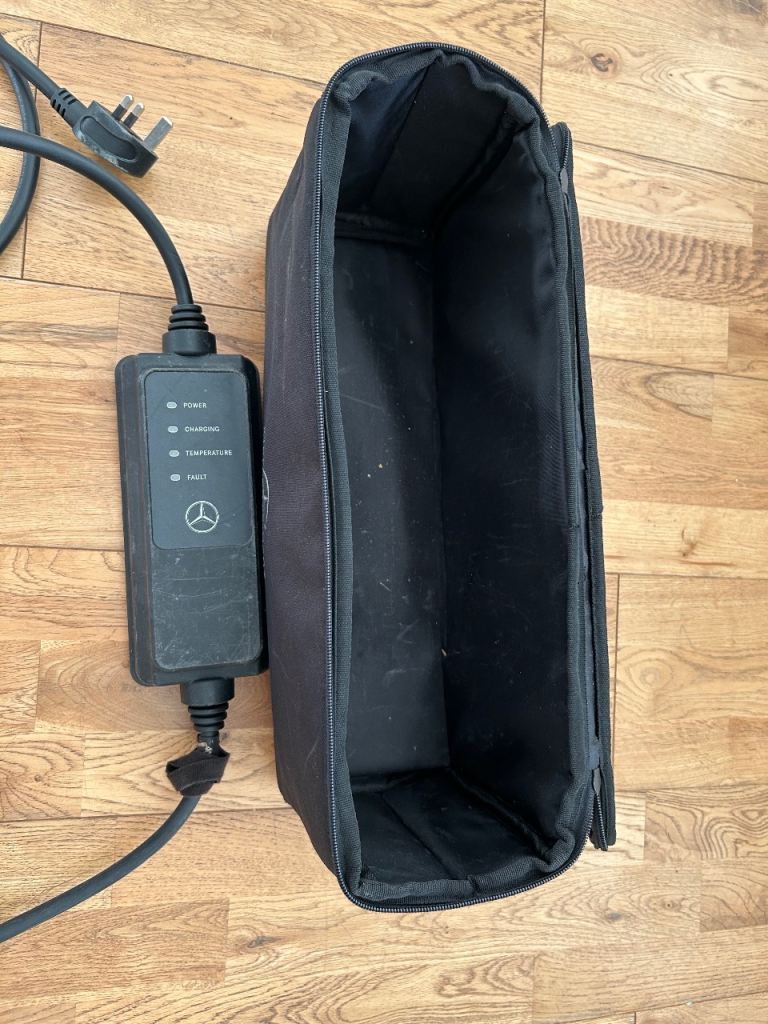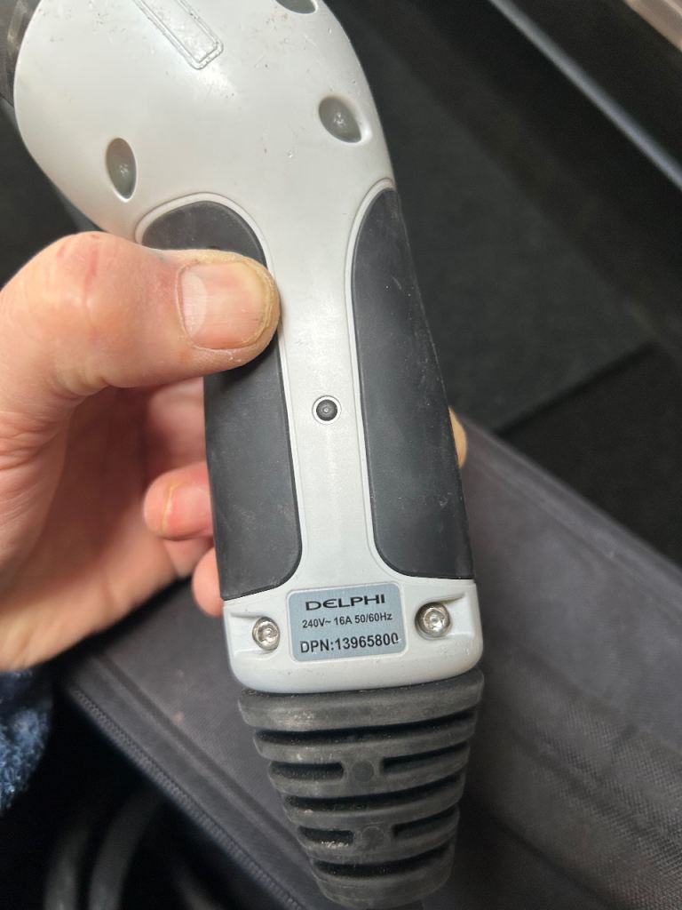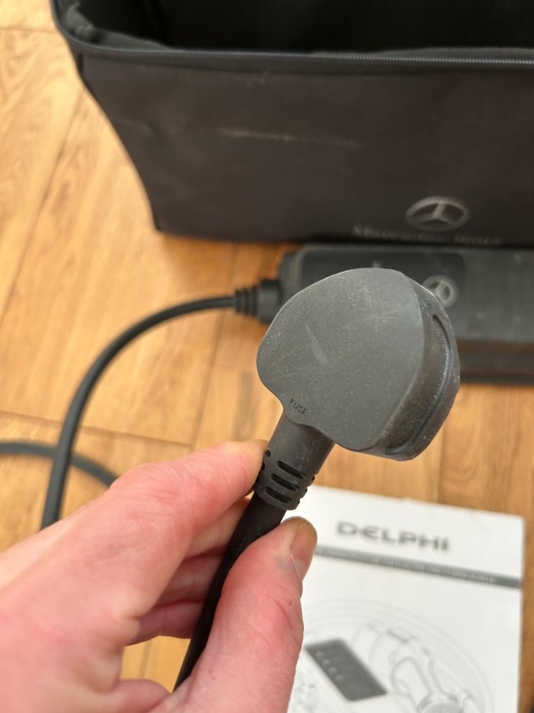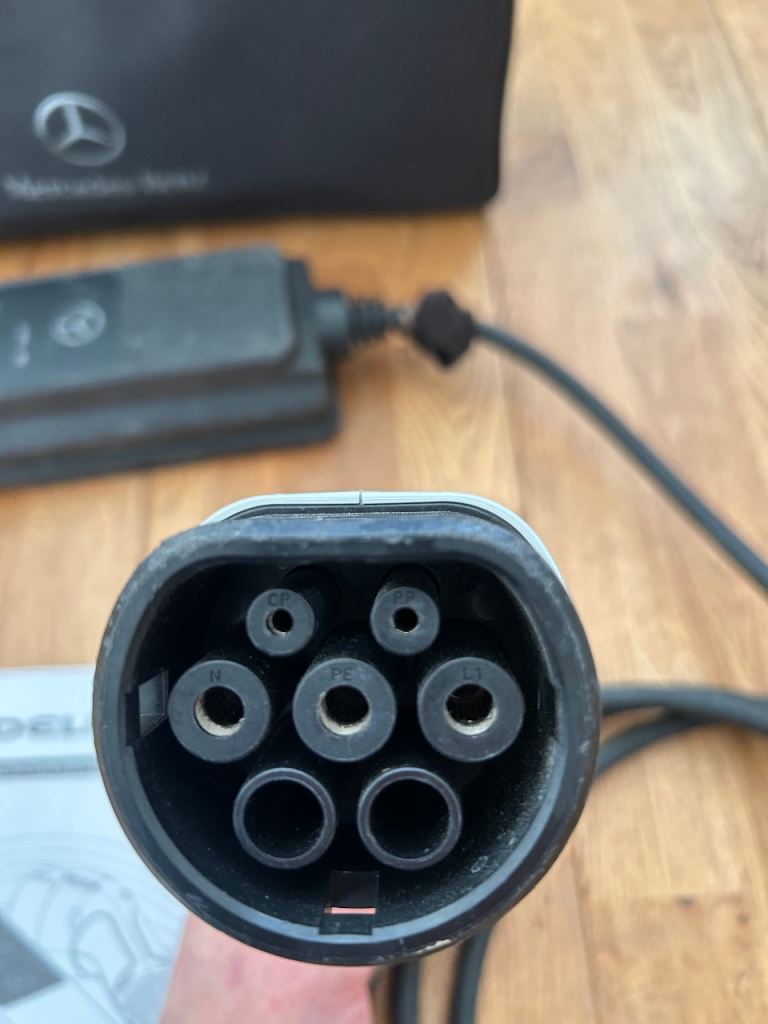 Came from old vehicle, no longer needed as now have full EV charger installed. Delphi 3pin 240v car charger. Mercedes Benz on branding, but can be used with any PHEV or EV.