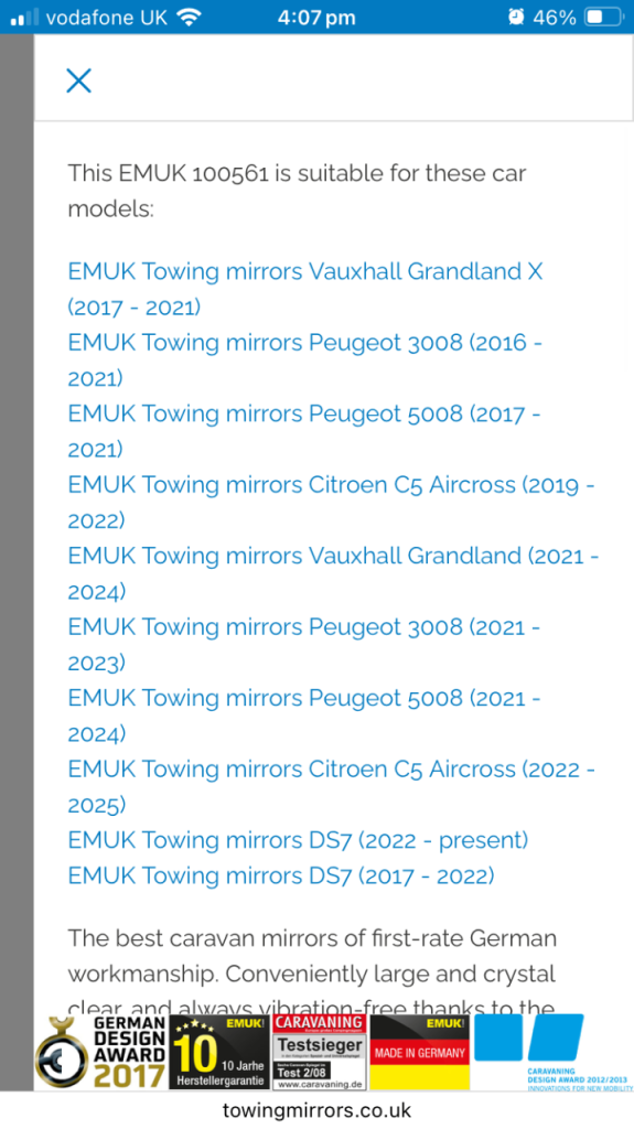 The model number is EMUK100561 and are purpose built for various Vauxhall Grandland & Grandland X, Peugeot 3008 & 5008 and Citroen C5 Aircross & DS7. Please see the last picture for a list of vehicles these mirrors fit. Please ensure they fit your vehicle before purchasing
