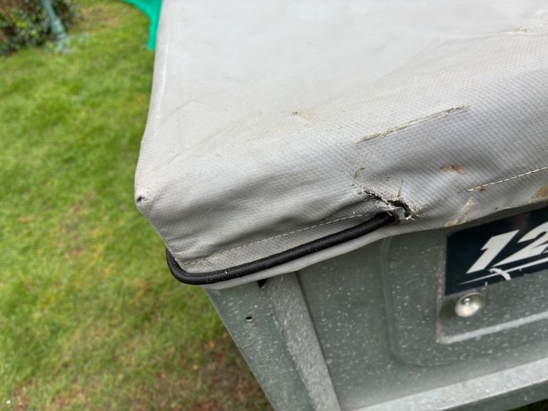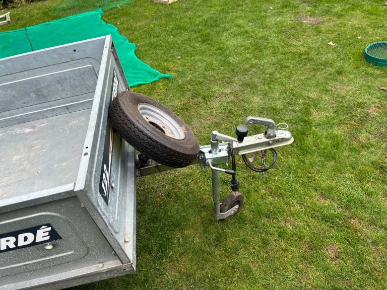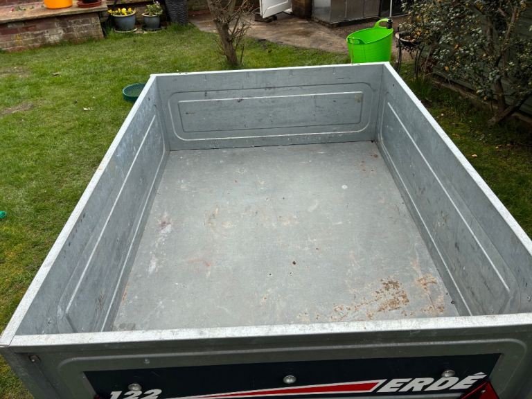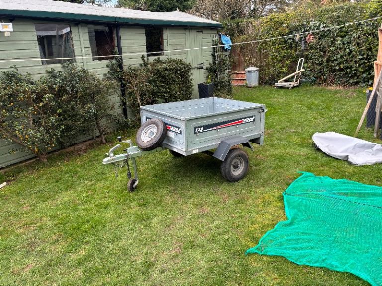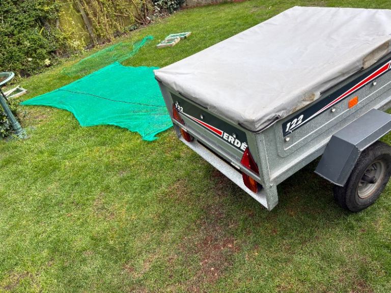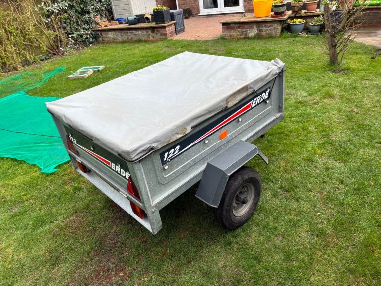 Erde 122 car trailer - good condition with jockey wheel, spare tyre and a cover which has one small tear in it as shown photos - buyer collects from Peterborough