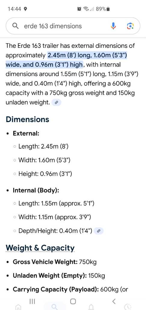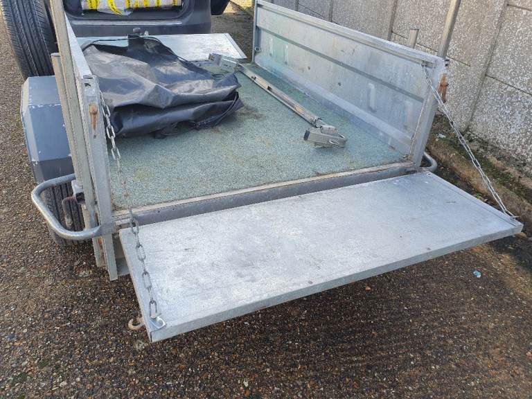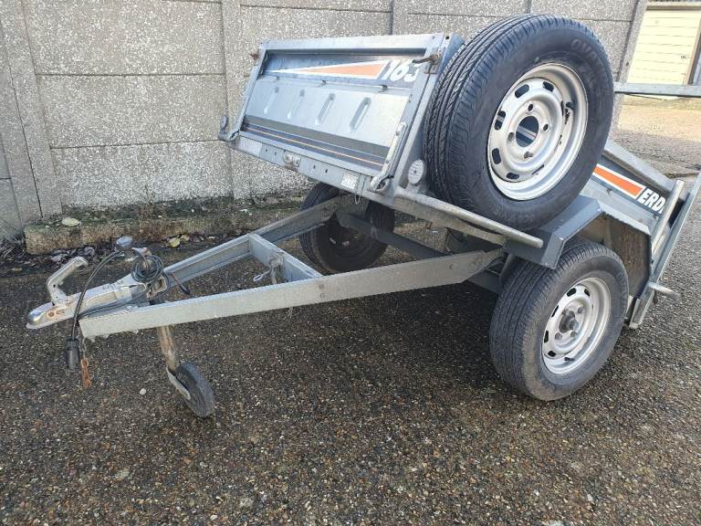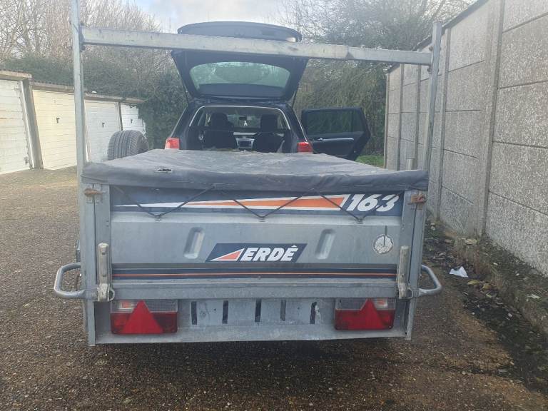 Erde 163 Trailer in good solid condition, with tipping function and rear +front opening, on 13-inch wheels with recent tyres and good bearing, comes with cover, ladder rack (can be moved to the front), unused spare wheel, jockey wheel, rear stabilisers drop legs, safety chain and working lights with 7pin plug. Viewing welcome