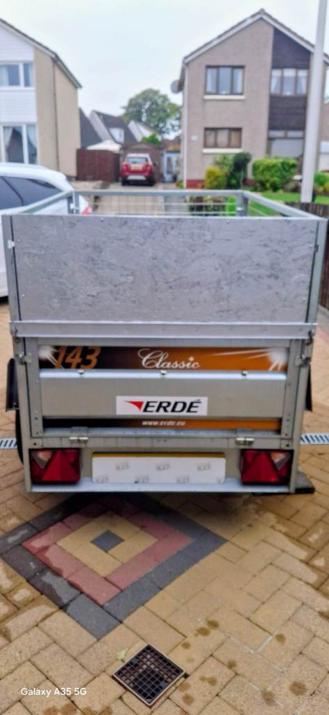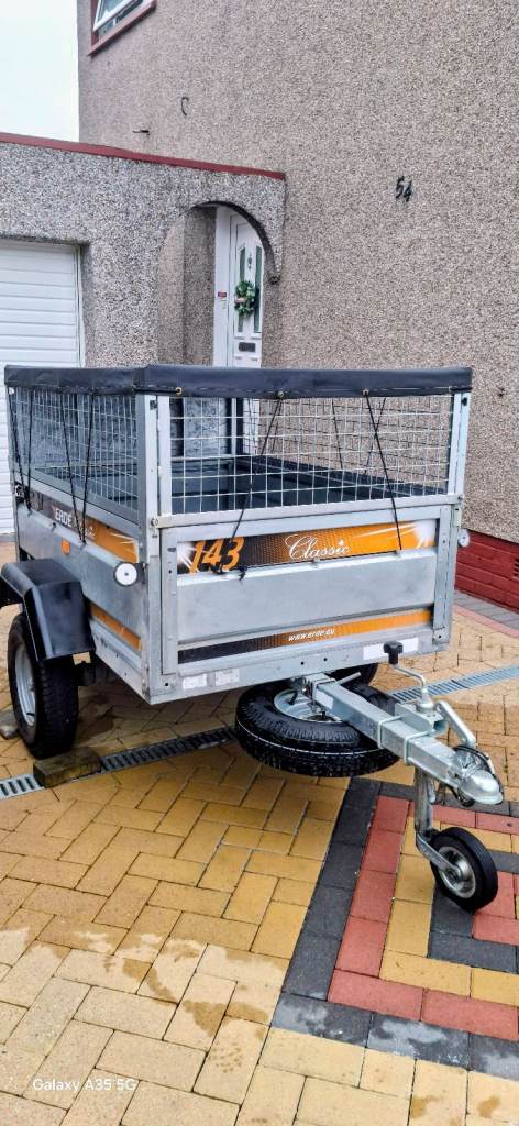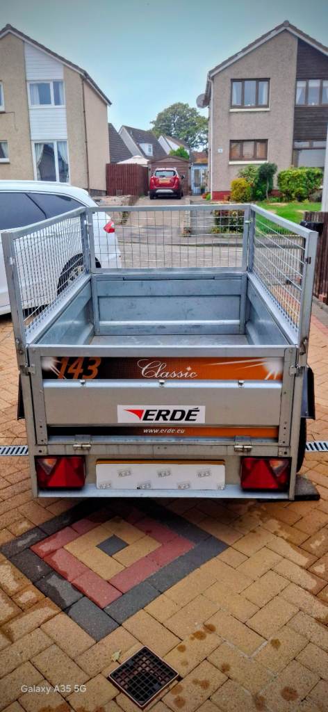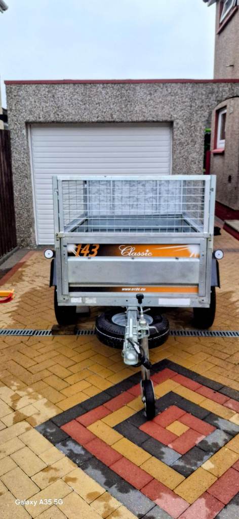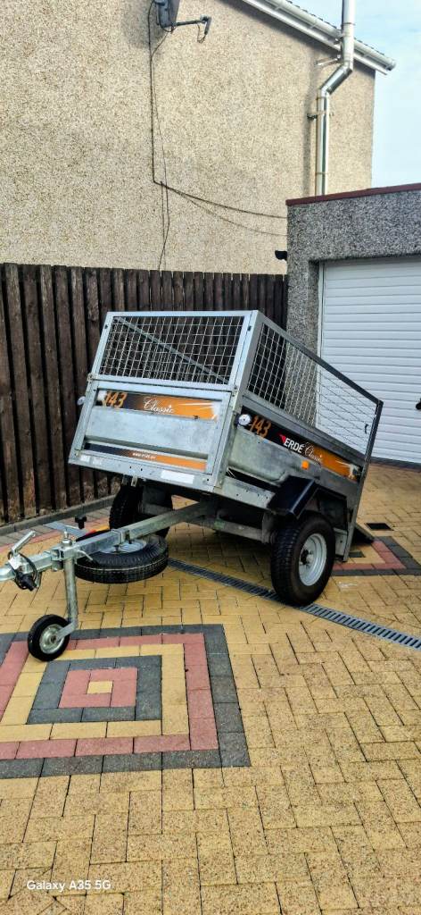 Erde classic 143 tipping trailer. Extras include, jocky wheel, spare wheel, mesh side extensions, top cover and wheel lock. Very good condition.
