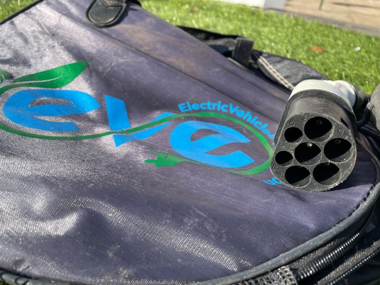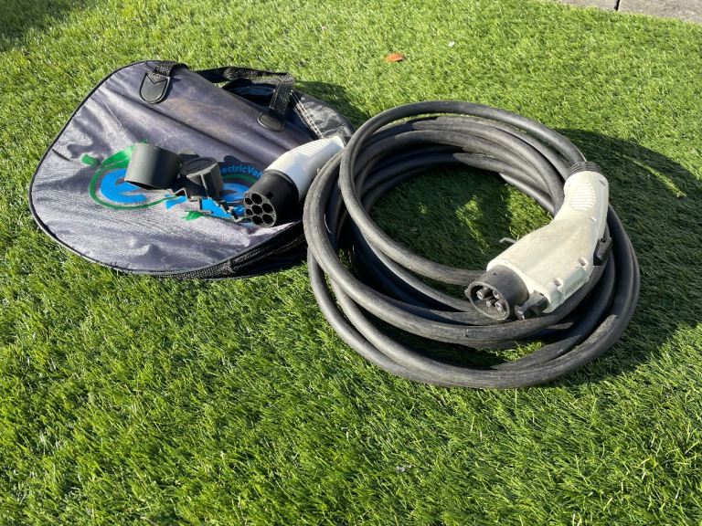 Charging cable for EV car. Type 1 to Type 2, 32A 240V AC. 10m long with protective caps and carry bag.