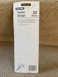 An unopened pack of 10 feeler guage blades from Halfords for measuring small gaps eg.tappets sparkplugs