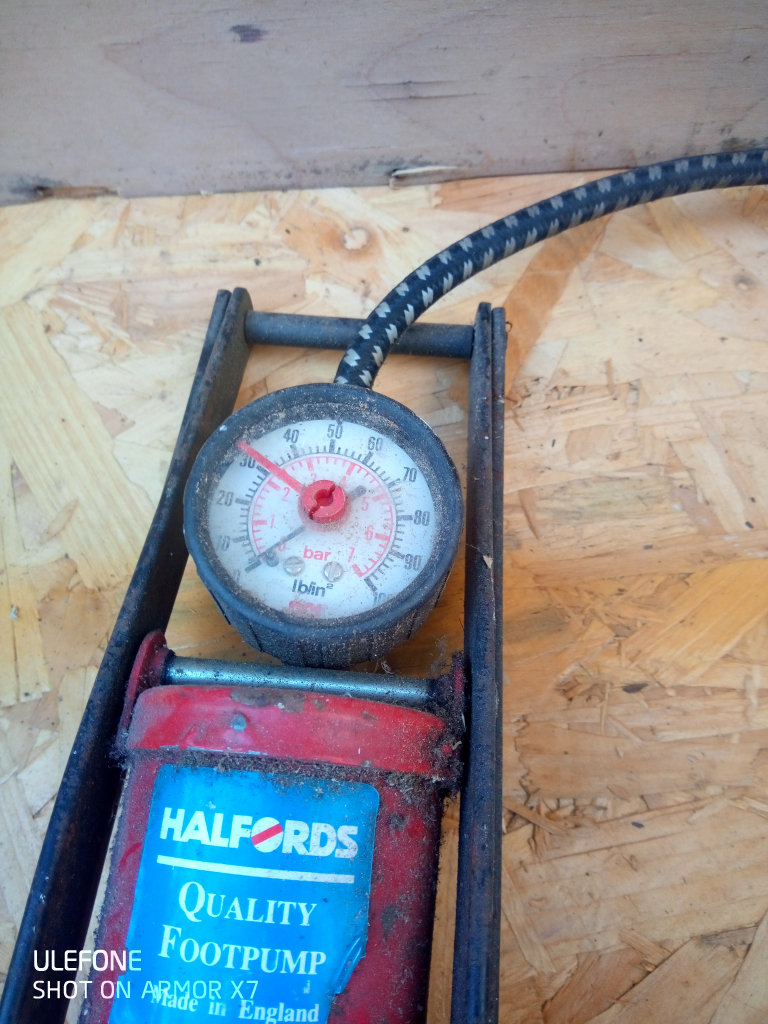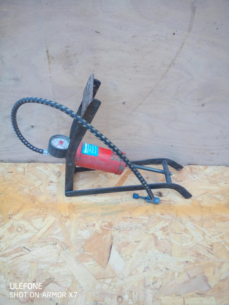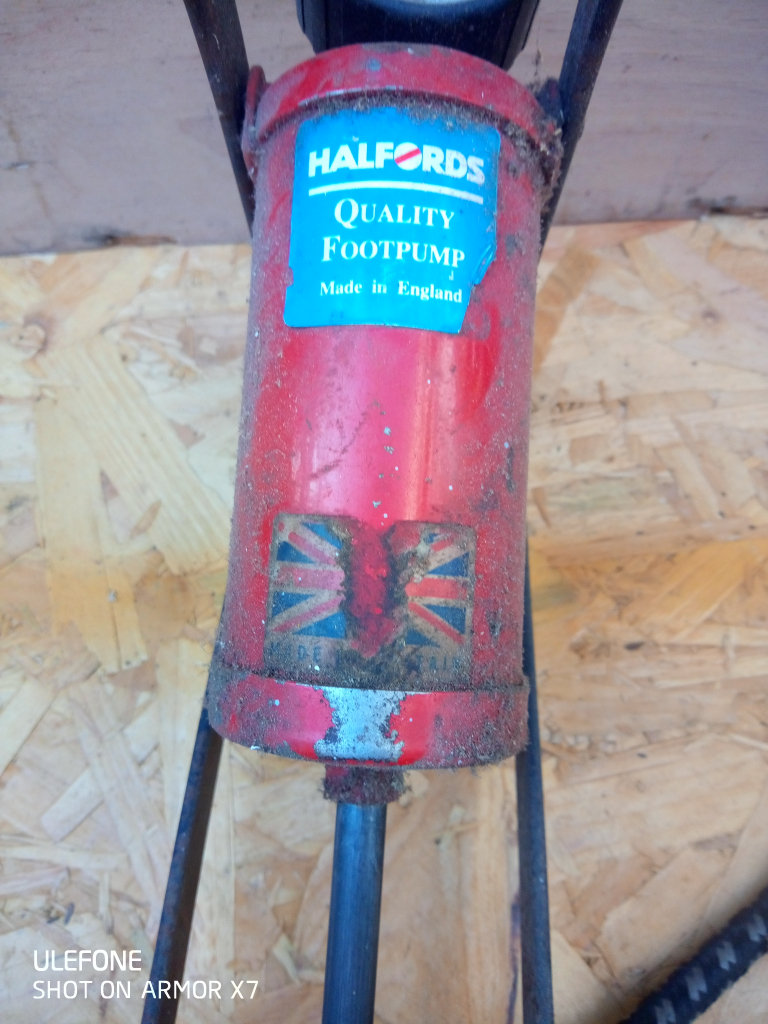 Manual foot pump. Halfords brand. Made in England. All works as should. Surplus to requirements as I have compressor now.