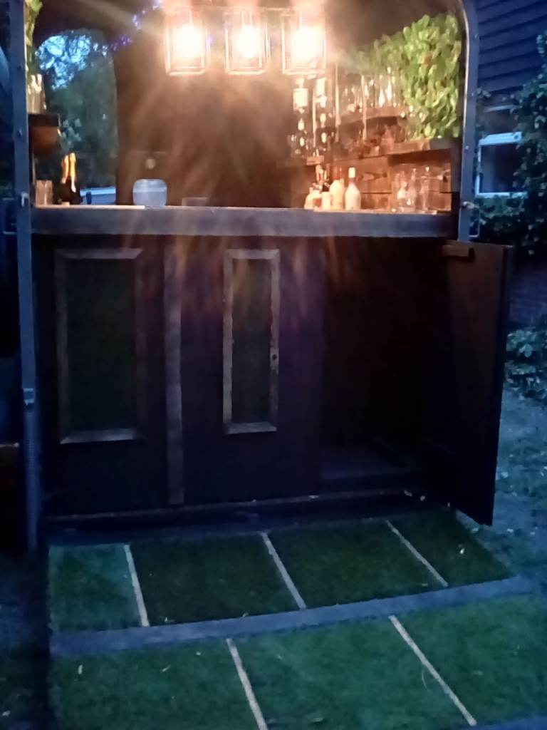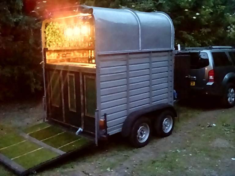 Gin /beer wine mobile bar horse trailer conversion great earner comes with fridge (room for another ) hot /cold tap ,optics storage attested for stock opening from front and rear looks great at any occasion ,Good rental return with or without stock used at weddings and music festivals street bar eke trials so can serve variety of drinks Teas coffees. Become your own boss for not much of lay out but unbelievable returns