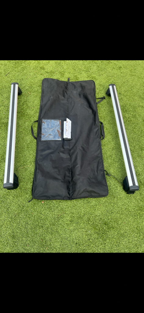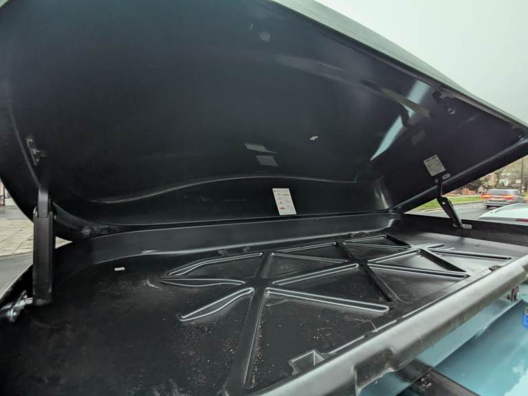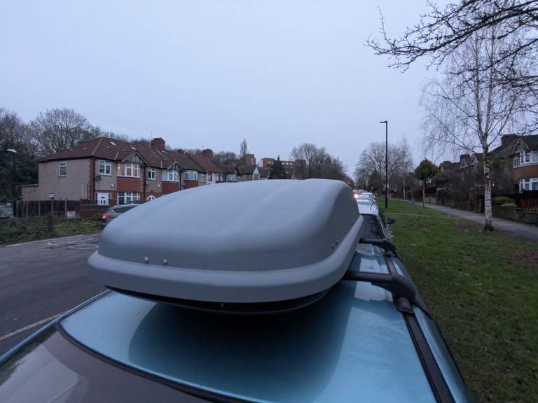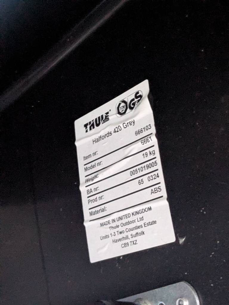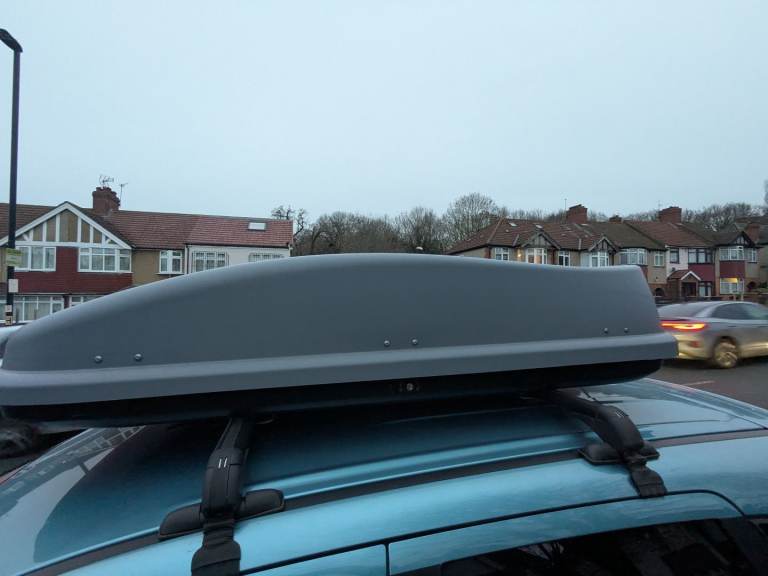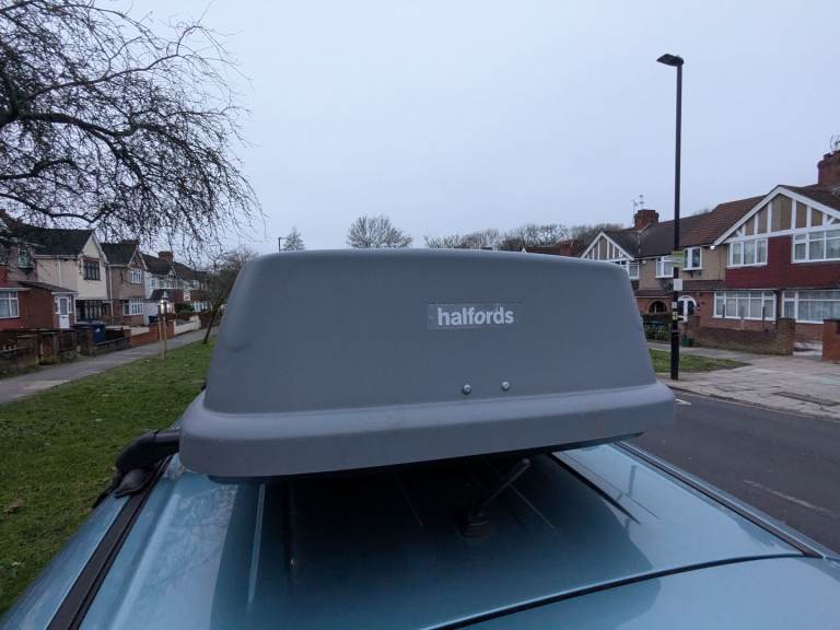 Posting for 13+ yearsHalfords 420, made by Thule, roof box with universal roof rack bars.