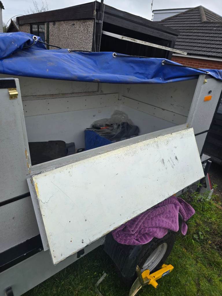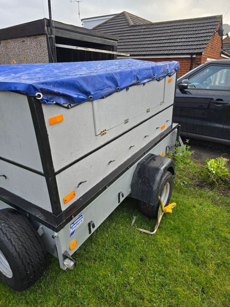 The trailer has been modified so built up. The sides come down as seen in pics, its been used for camping equipment, So is very clean. Not used much and comes with wheel clamp. Fully water proof with tarp roof. £800 for a quick sale. All measurements are in the pics. Collection southwell