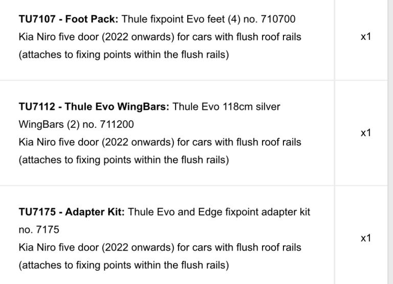 Only used once for our roof box. Thule bars, feet and roof adapter kit to screw into the black rails on roof of the Kia Niro EV.