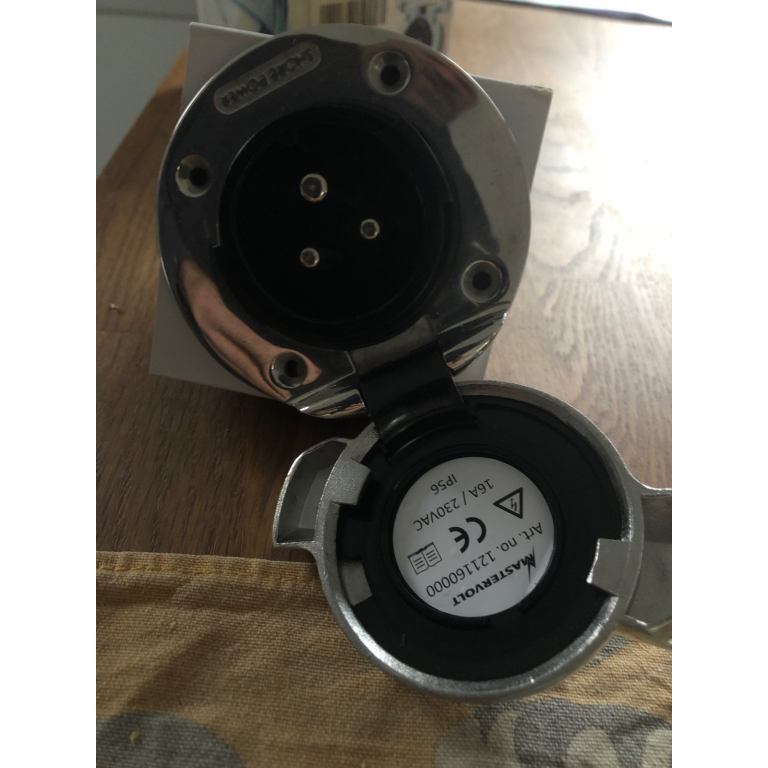 The brand is Mastervolt and it’s a 16amp shore power inlet socket for boats wanting to connect to the mains power, could be used on a camper van or motor home. All stainless and cost me £125 plus vat so I’m selling on as it’s been in the cupboard for 4 years untouched